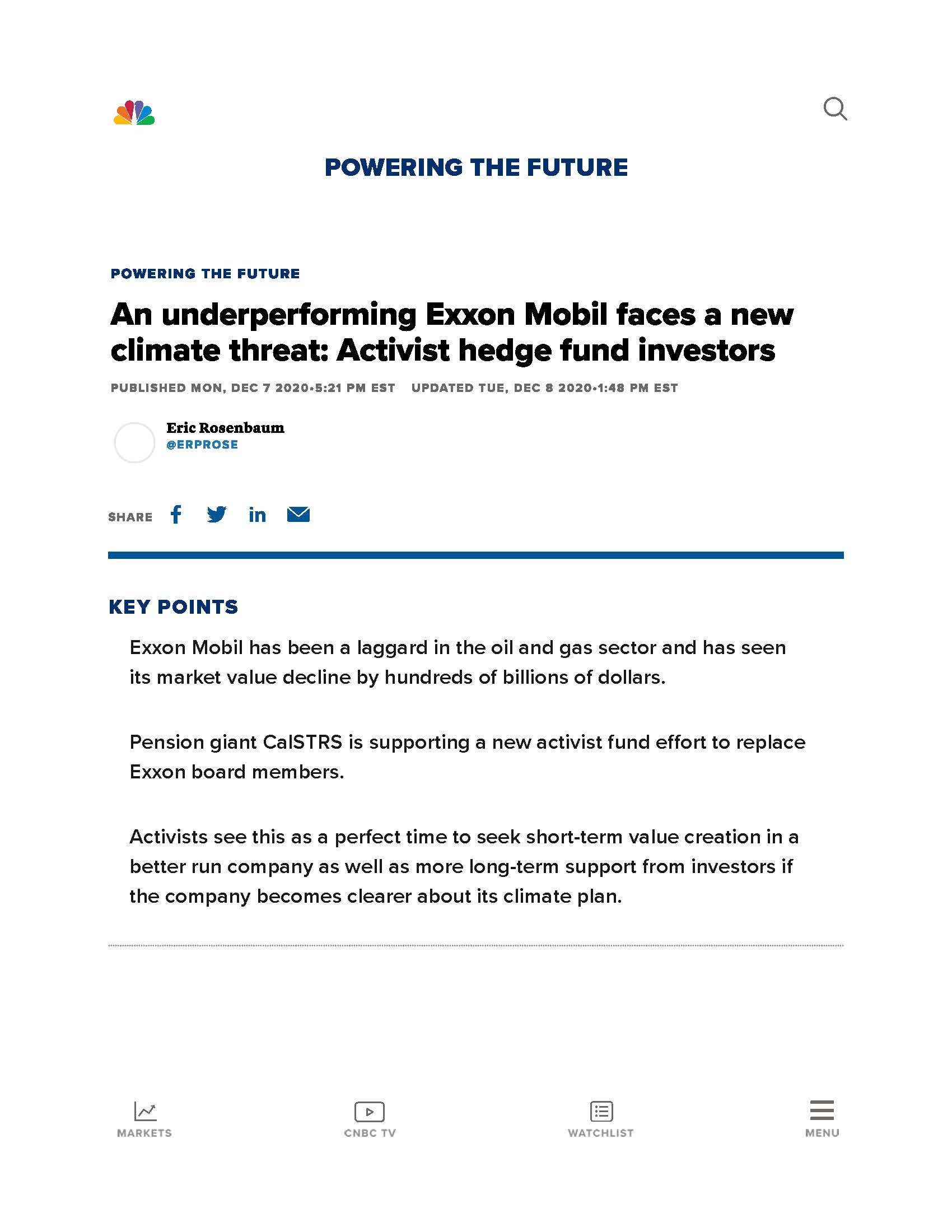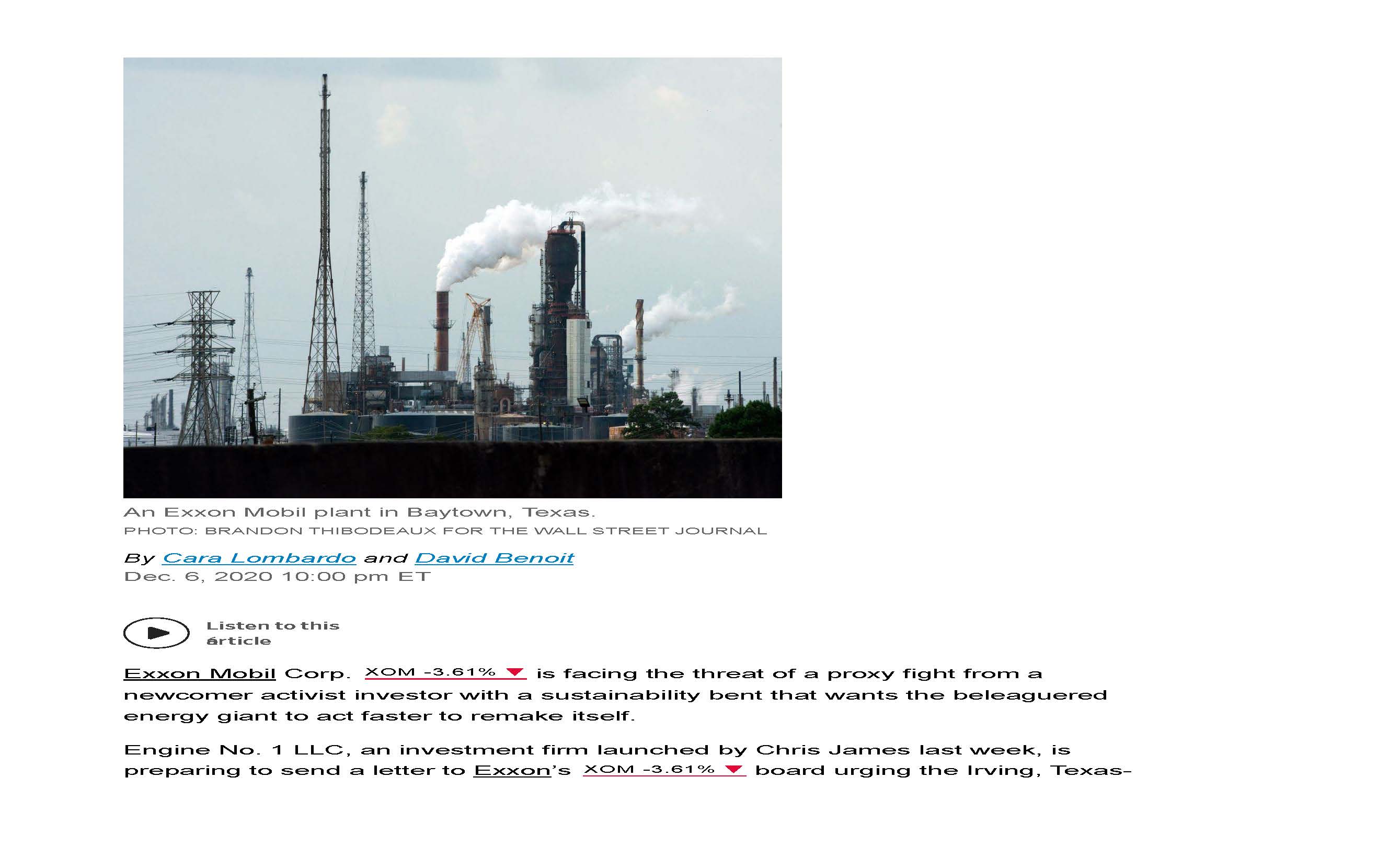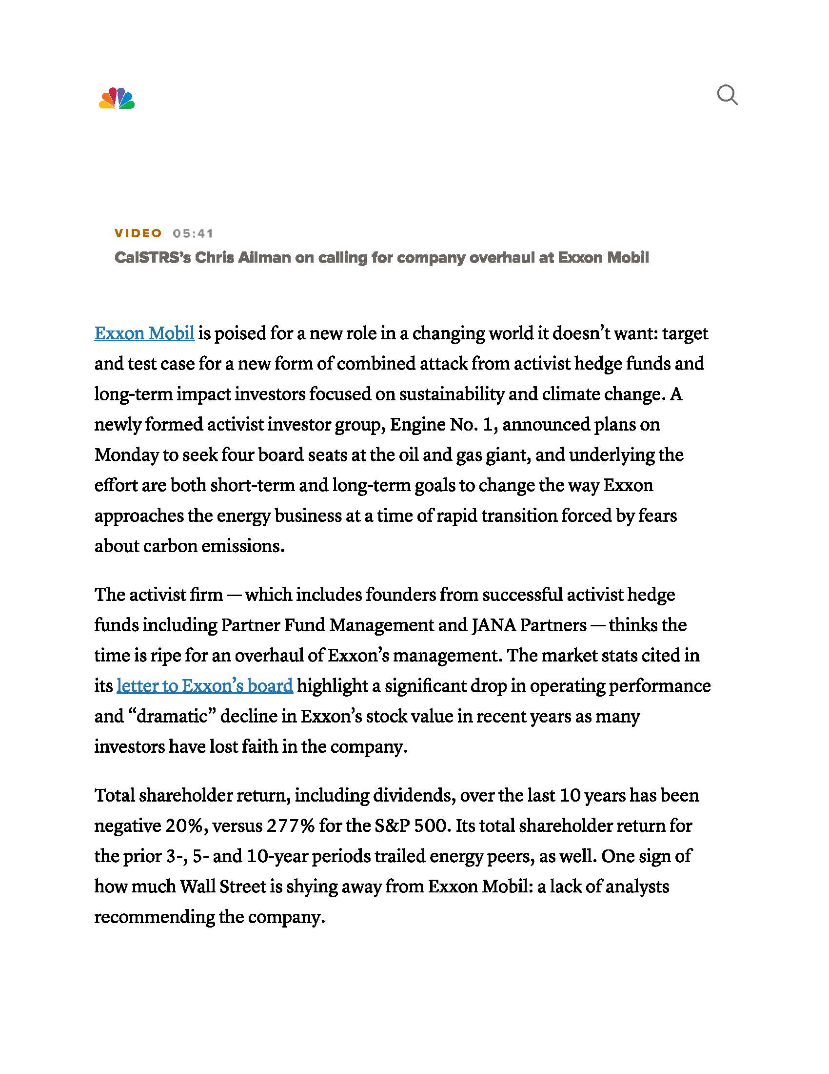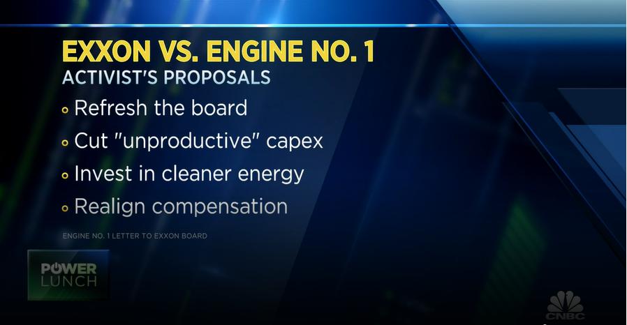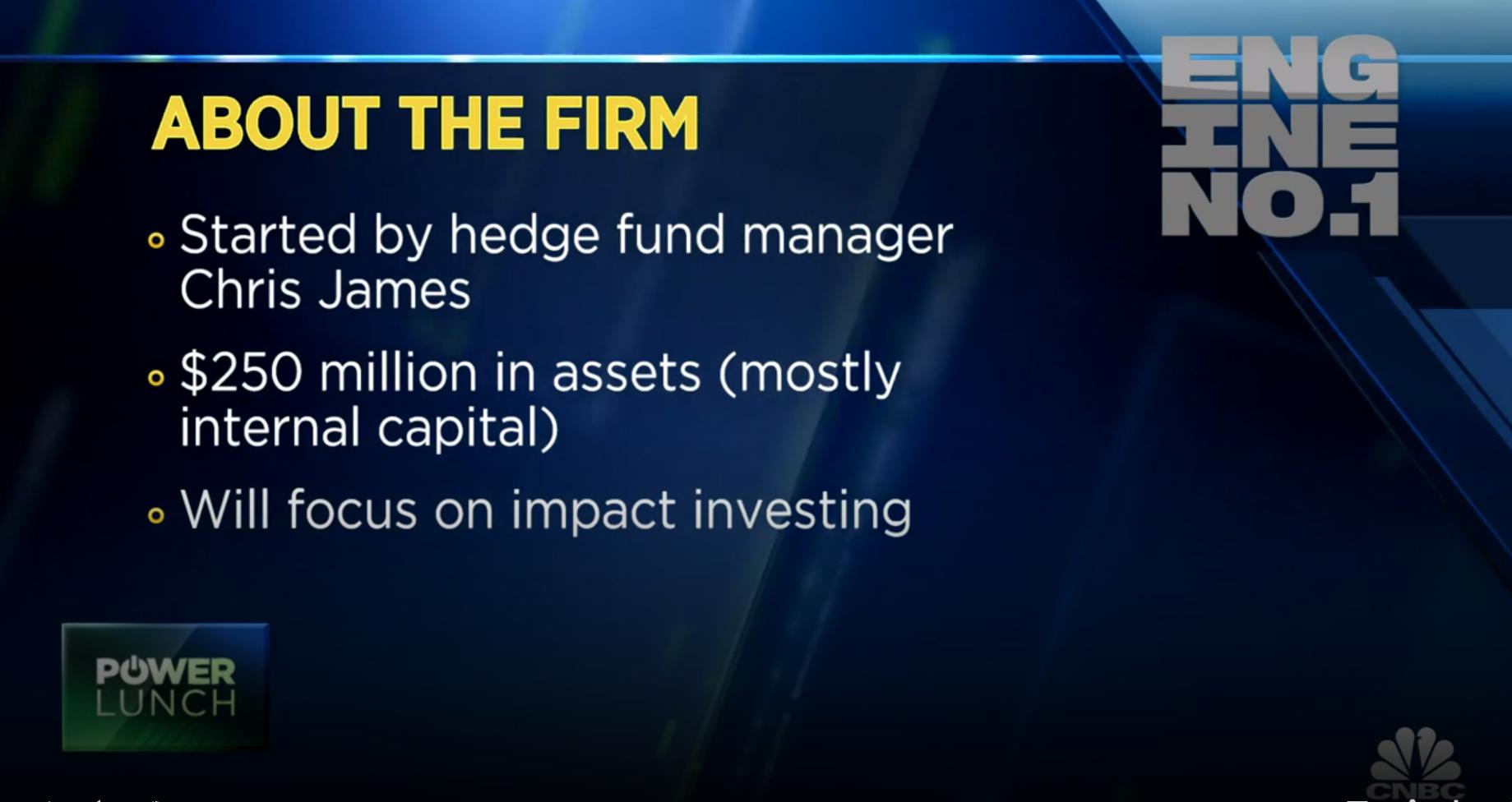Leslie Picker: It used to be that ESG meant screening out companies that don't comply, but lately activist investors are screening in companies that would be the antithesis of ESG, like big oil and then pushing for changes. That's what's going on at Exxon right now. A new firm called Engine No. 1 led by an under the radar hedge fund manager, Chris James, is running a proxy fight seeking to overhaul the business by installing four directors to the board. Their bulk of their goal is to diversify the business into more clean energy while slashing costs elsewhere to ensure that that sacred dividend is protected. Now the 17-day old firm has just $250 million dollars in assets, mostly James's own money and its stake in Exxon is a nominal $40 million dollars or about .02% of Exxon's market cap but CalSTRS already supports the proposal and D.E. Shaw has reportedly built up a position and is pushing for similar demands as Engine No. 1. As Josh Black of Activist Insight puts it, "Building and maintaining its coalition of outside investors will be a formidable challenge but if marrying environmental impact and profitability proves to be a winning strategy, the next few years will see that convergence continue." In other words, expect more campaigns like this one in 2021.