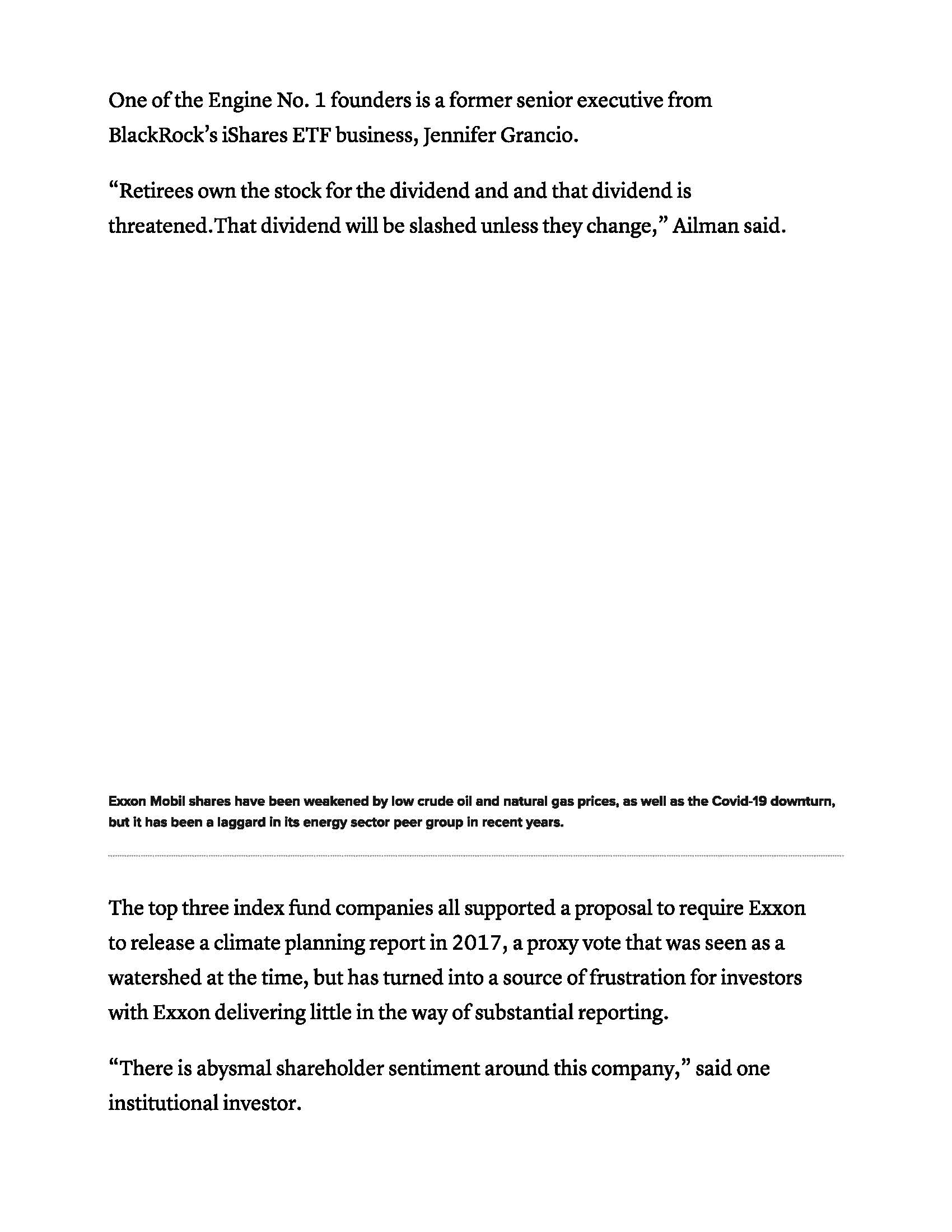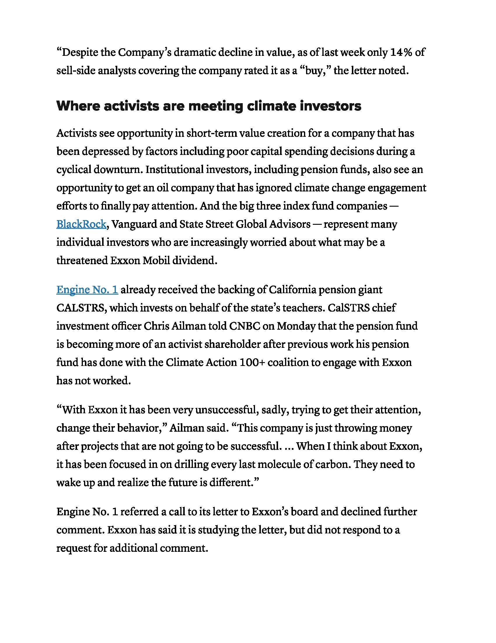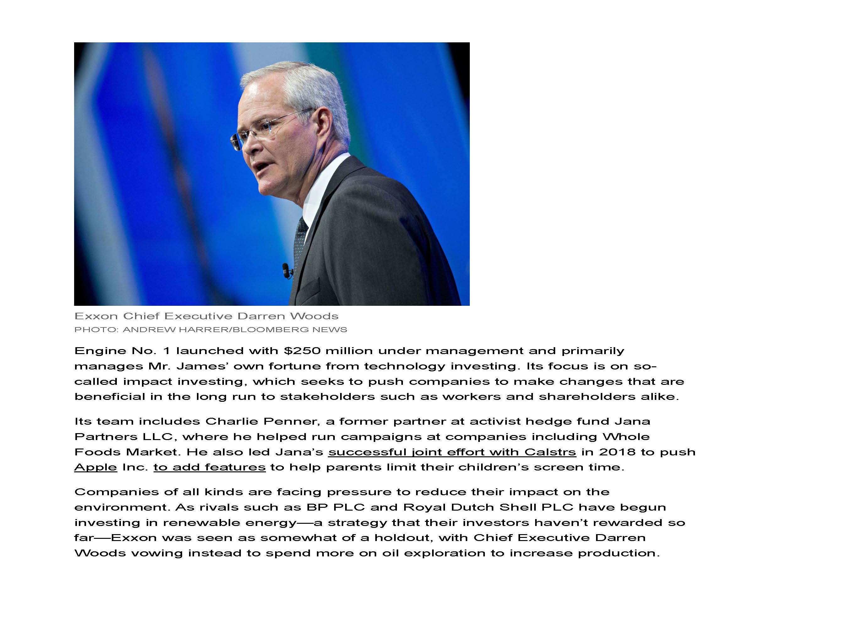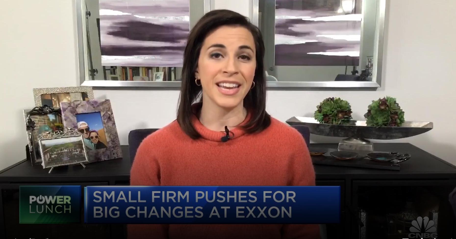 Leslie Picker: It used to be that ESG meant screening out companies that don't comply, but lately activist investors are screening in companies that would be the antithesis of ESG, like big oil and then pushing for changes. That's what's going on at Exxon right now. A new firm called Engine No. 1 led by an under the radar hedge fund manager, Chris James, is running a proxy fight seeking to overhaul the business by installing four directors to the board. Their bulk of their goal is to diversify the business into more clean energy while slashing costs elsewhere to ensure that that sacred dividend is protected. Now the 17-day old firm has just $250 million dollars in assets, mostly James's own money and its stake in Exxon is a nominal $40 million dollars or about .02% of Exxon's market cap but CalSTRS already supports the proposal and D.E. Shaw has reportedly built up a position and is pushing for similar demands as Engine No. 1. As Josh Black of Activist Insight puts it, "Building and maintaining its coalition of outside investors will be a formidable challenge but if marrying environmental impact and profitability proves to be a winning strategy, the next few years will see that convergence continue." In other words, expect more campaigns like this one in 2021.