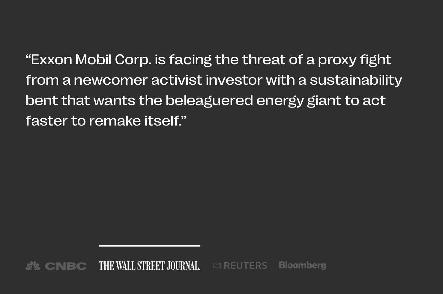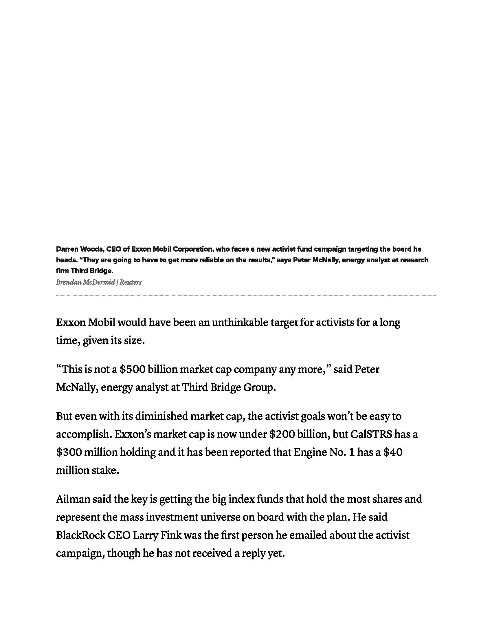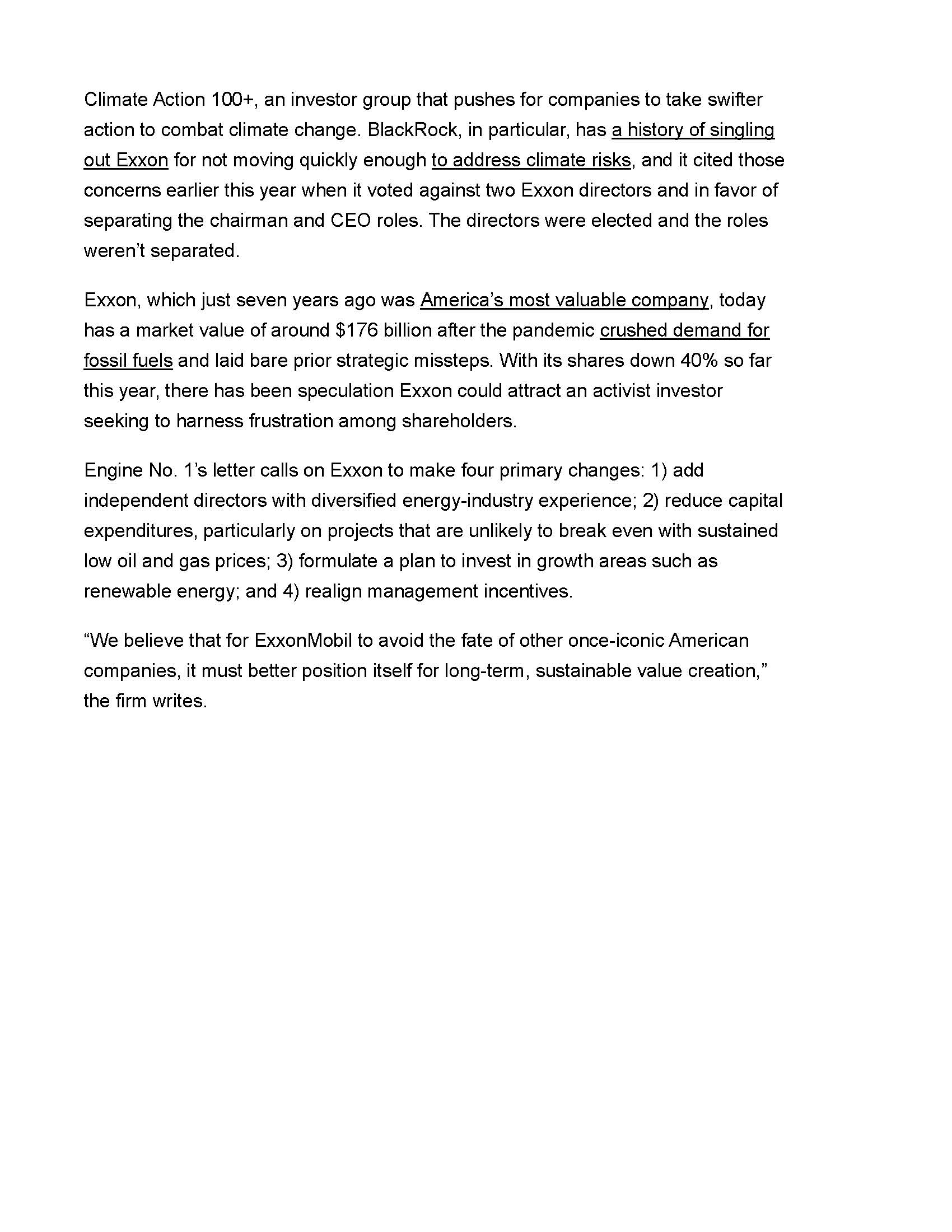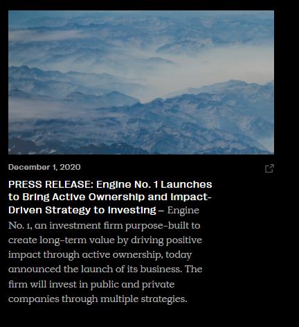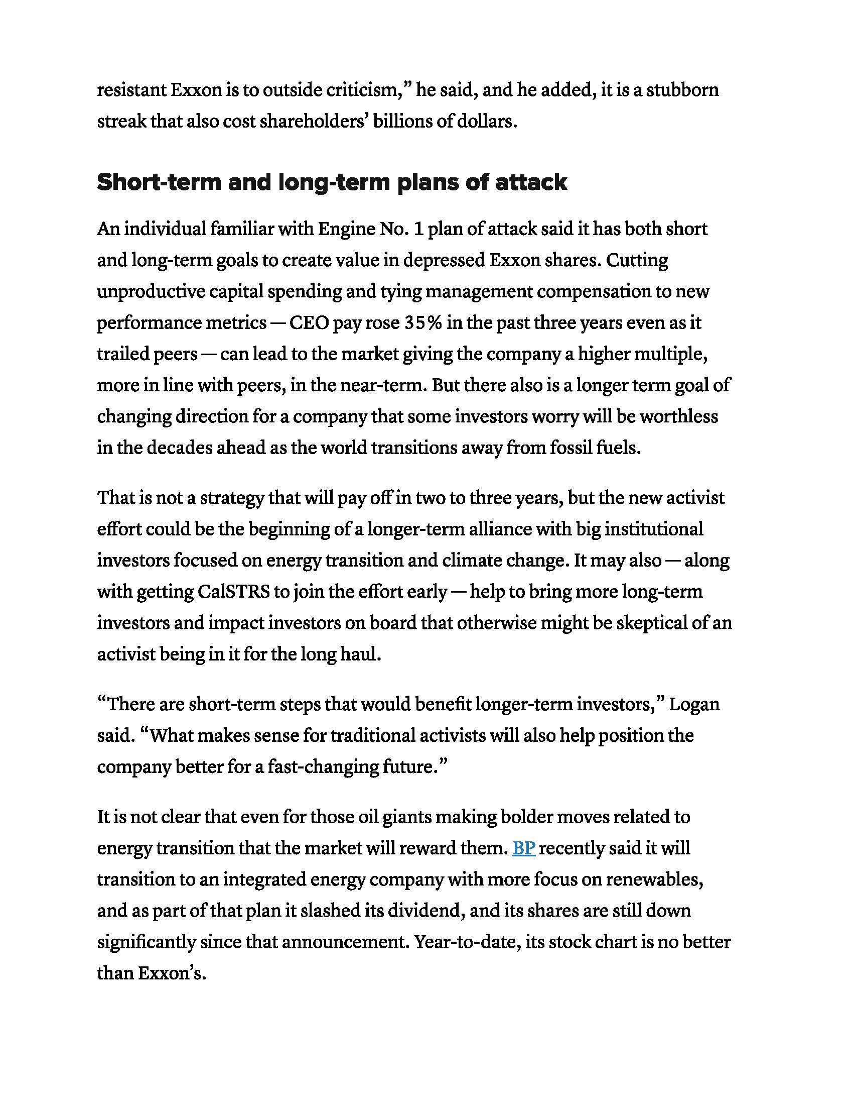 Leslie Picker: It used to be that ESG meant screening out companies that don't comply, but lately activist investors are screening in companies that would be the antithesis of ESG, like big oil and then pushing for changes. That's what's going on at Exxon right now. A new firm called Engine No. 1 led by an under the radar hedge fund manager, Chris James, is running a proxy fight seeking to overhaul the business by installing four directors to the board. Their bulk of their goal is to diversify the business into more clean energy while slashing costs elsewhere to ensure that that sacred dividend is protected. Now the 17-day old firm has just $250 million dollars in assets, mostly James's own money and its stake in Exxon is a nominal $40 million dollars or about .02% of Exxon's market cap but CalSTRS already supports the proposal and D.E. Shaw has reportedly built up a position and is pushing for similar demands as Engine No. 1. As Josh Black of Activist Insight puts it, "Building and maintaining its coalition of outside investors will be a formidable challenge but if marrying environmental impact and profitability proves to be a winning strategy, the next few years will see that convergence continue." In other words, expect more campaigns like this one in 2021.
