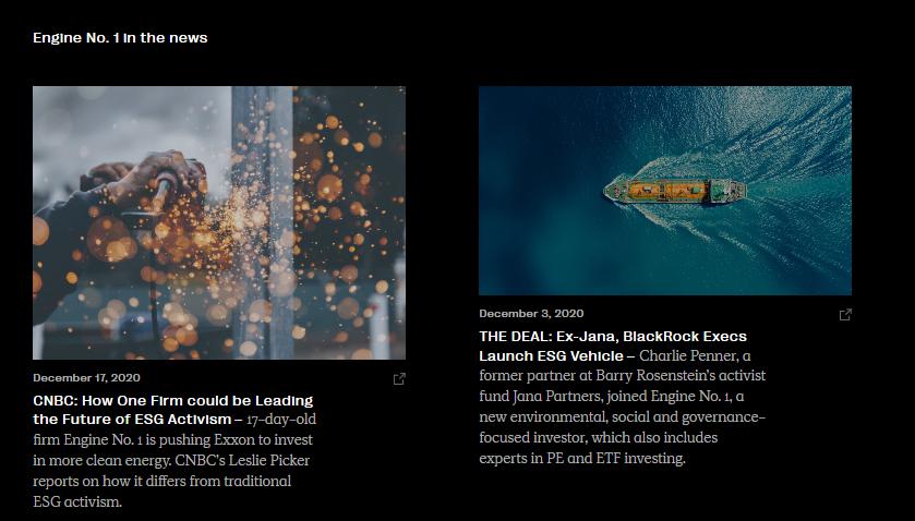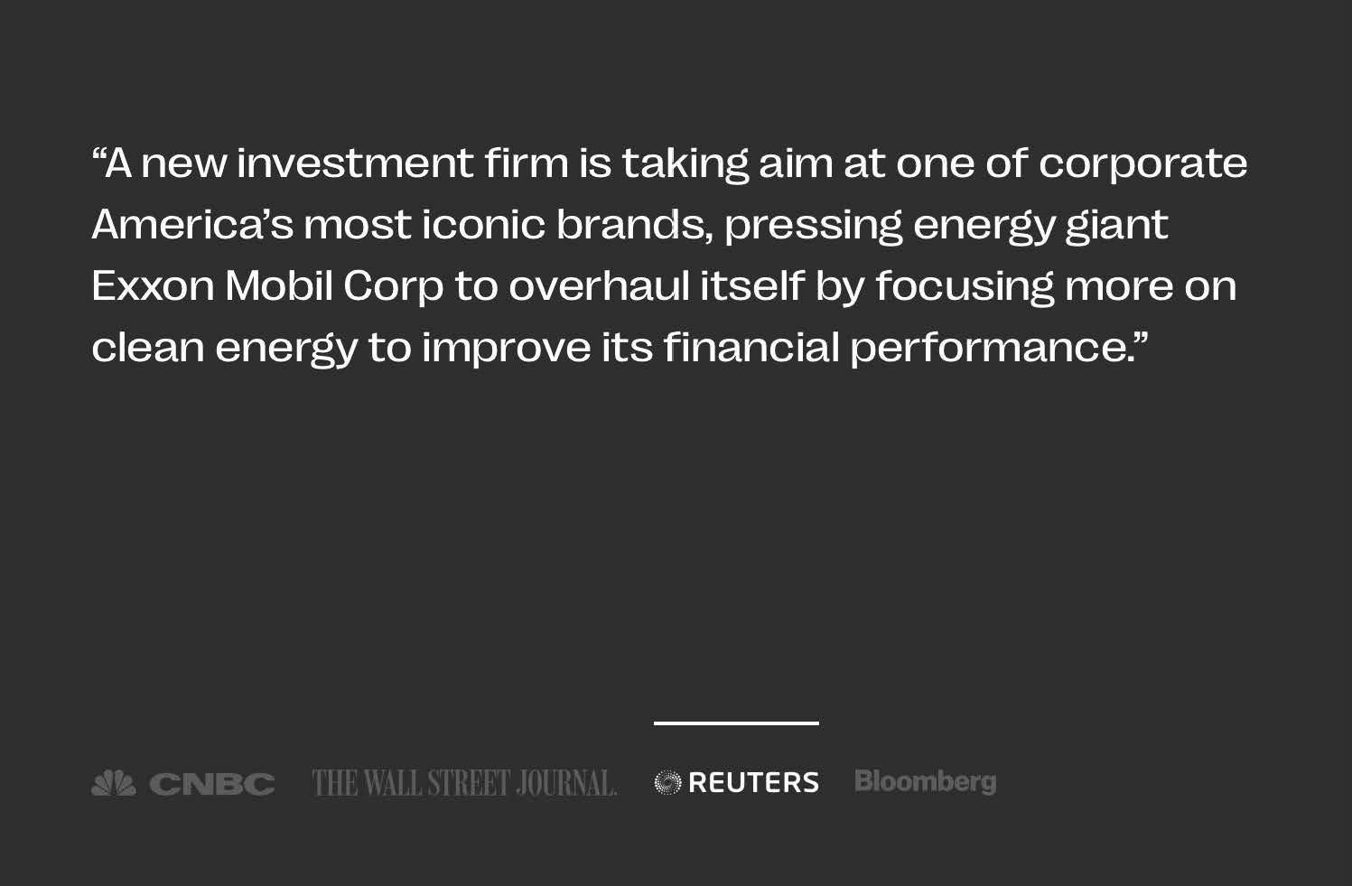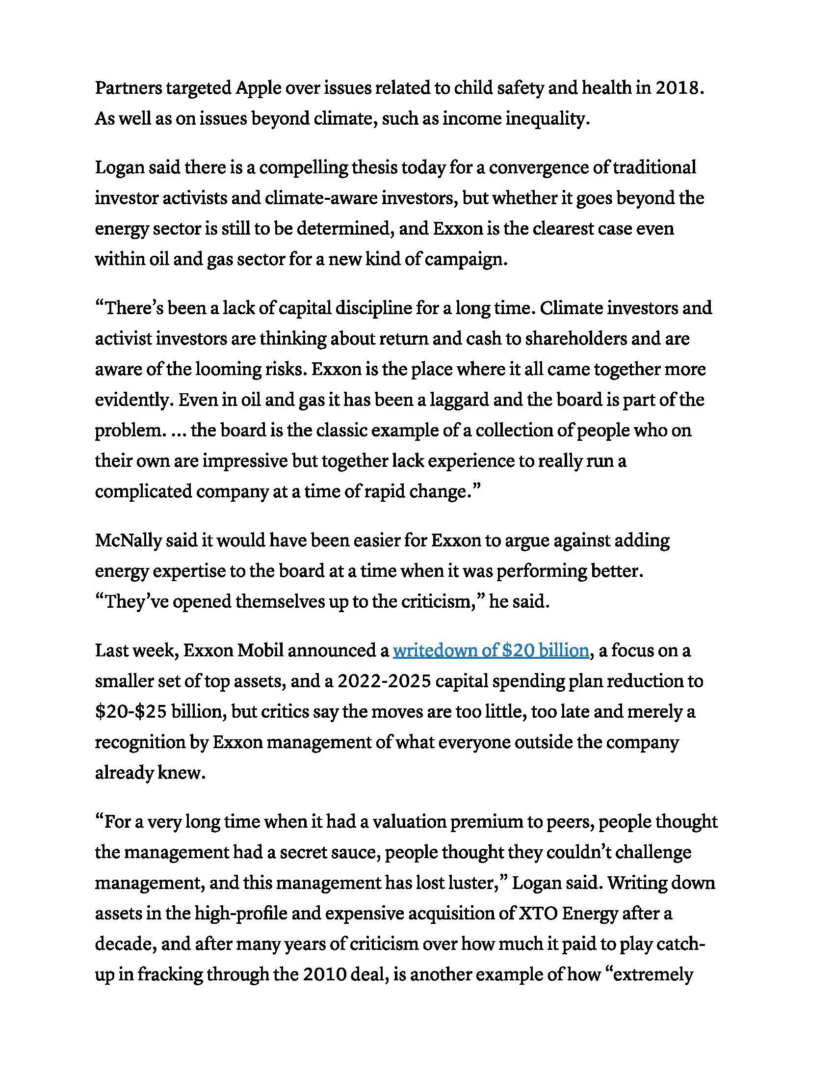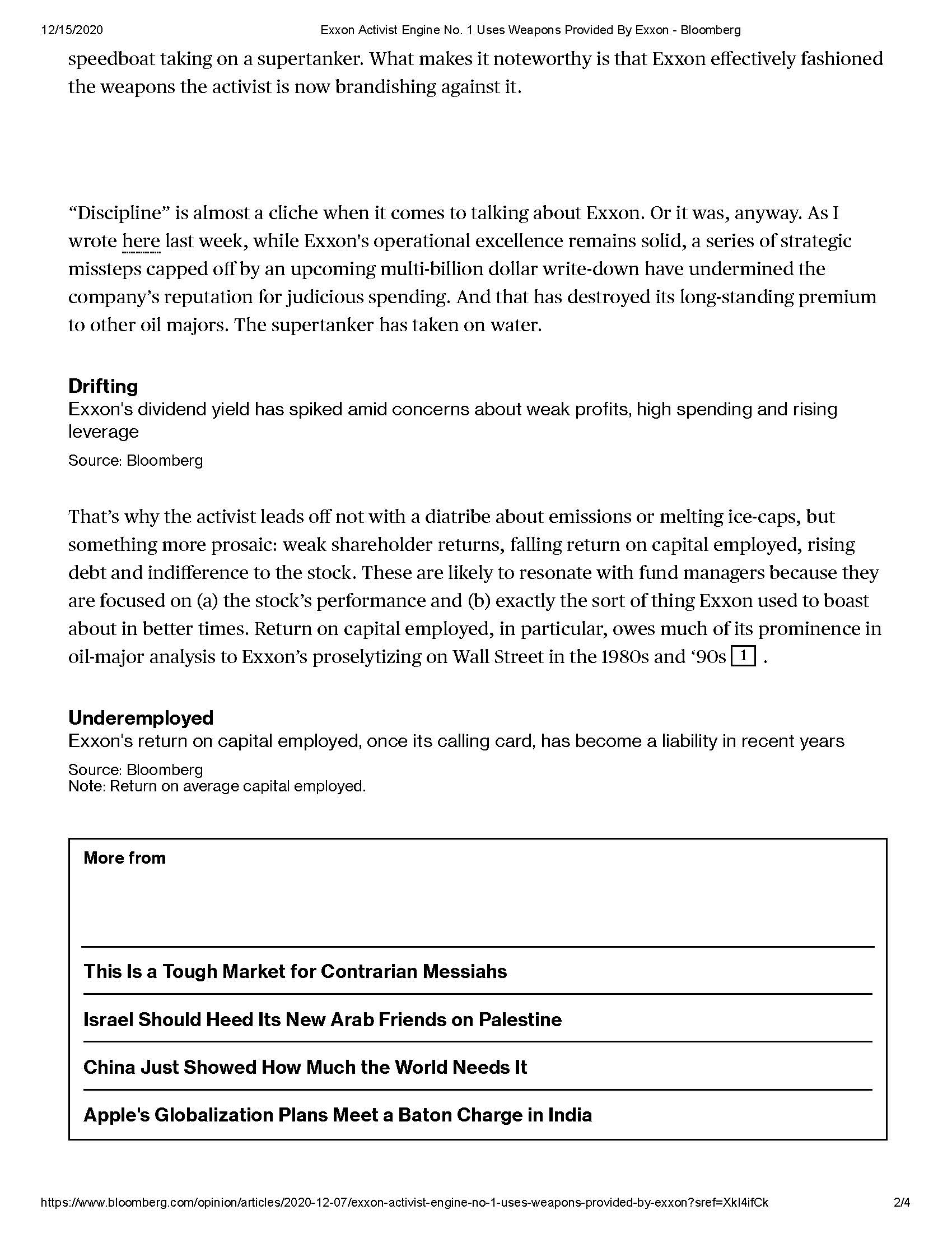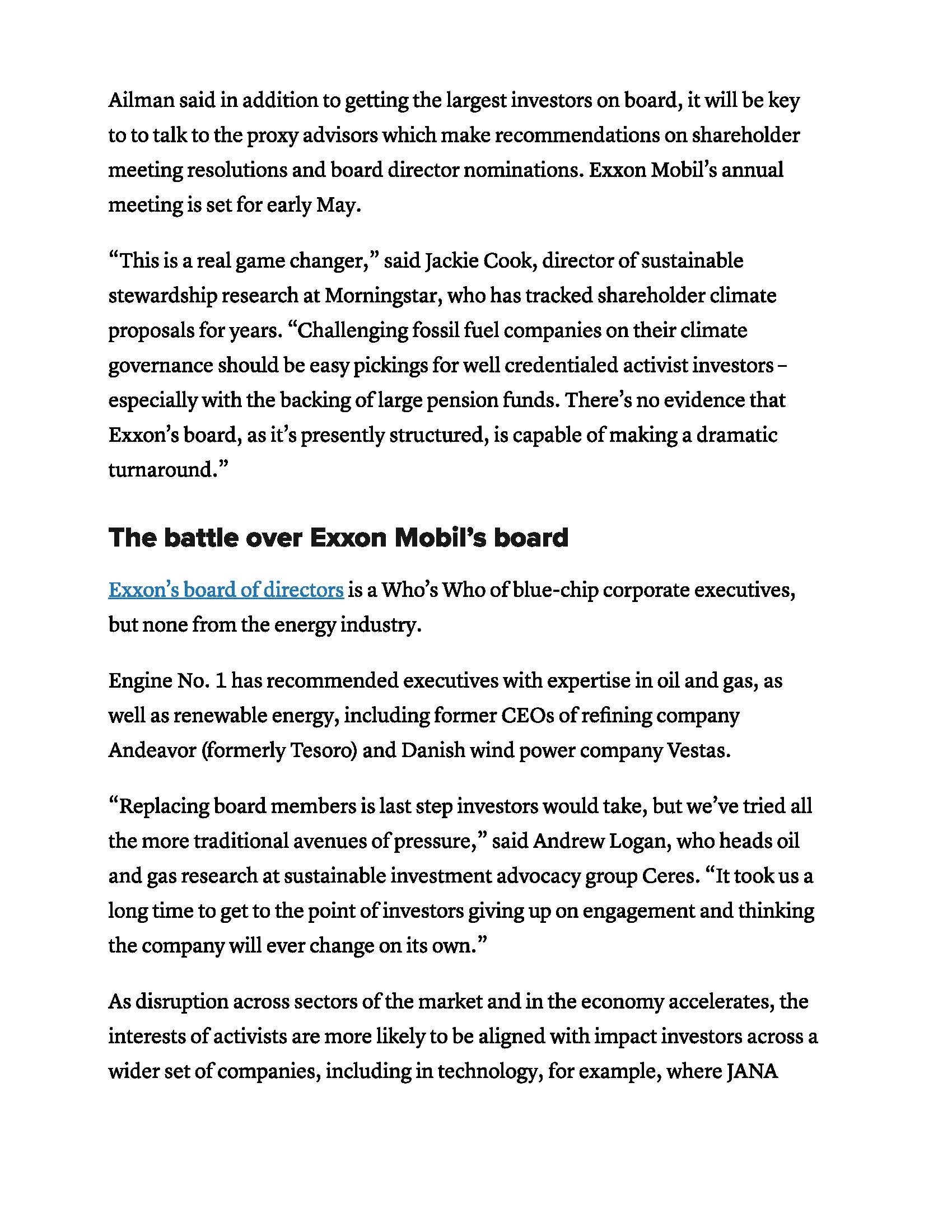 Leslie Picker: It used to be that ESG meant screening out companies that don't comply, but lately activist investors are screening in companies that would be the antithesis of ESG, like big oil and then pushing for changes. That's what's going on at Exxon right now. A new firm called Engine No. 1 led by an under the radar hedge fund manager, Chris James, is running a proxy fight seeking to overhaul the business by installing four directors to the board. Their bulk of their goal is to diversify the business into more clean energy while slashing costs elsewhere to ensure that that sacred dividend is protected. Now the 17-day old firm has just $250 million dollars in assets, mostly James's own money and its stake in Exxon is a nominal $40 million dollars or about .02% of Exxon's market cap but CalSTRS already supports the proposal and D.E. Shaw has reportedly built up a position and is pushing for similar demands as Engine No. 1. As Josh Black of Activist Insight puts it, "Building and maintaining its coalition of outside investors will be a formidable challenge but if marrying environmental impact and profitability proves to be a winning strategy, the next few years will see that convergence continue." In other words, expect more campaigns like this one in 2021.