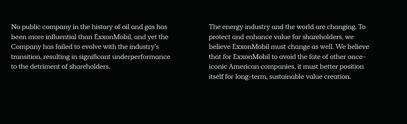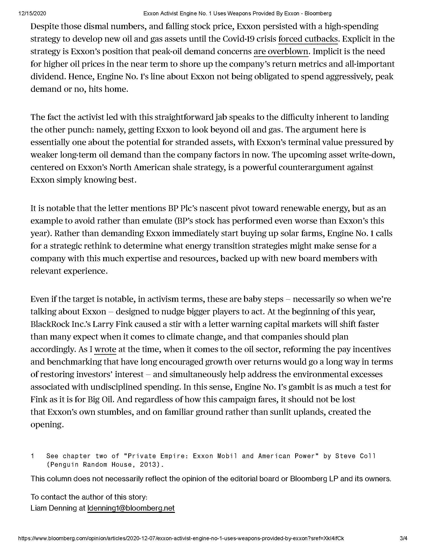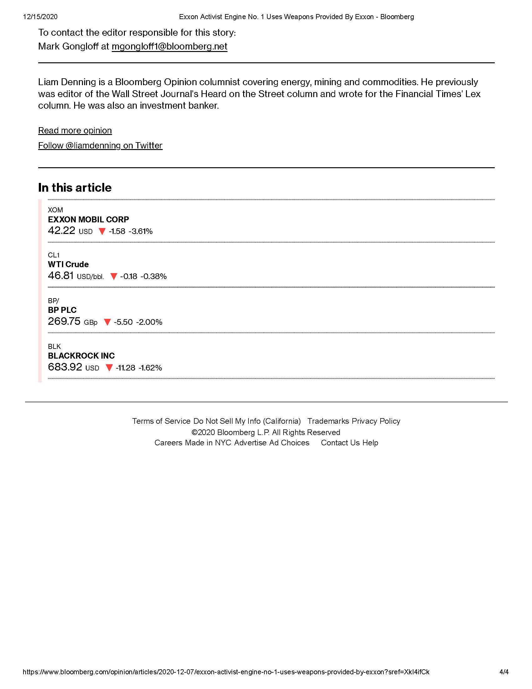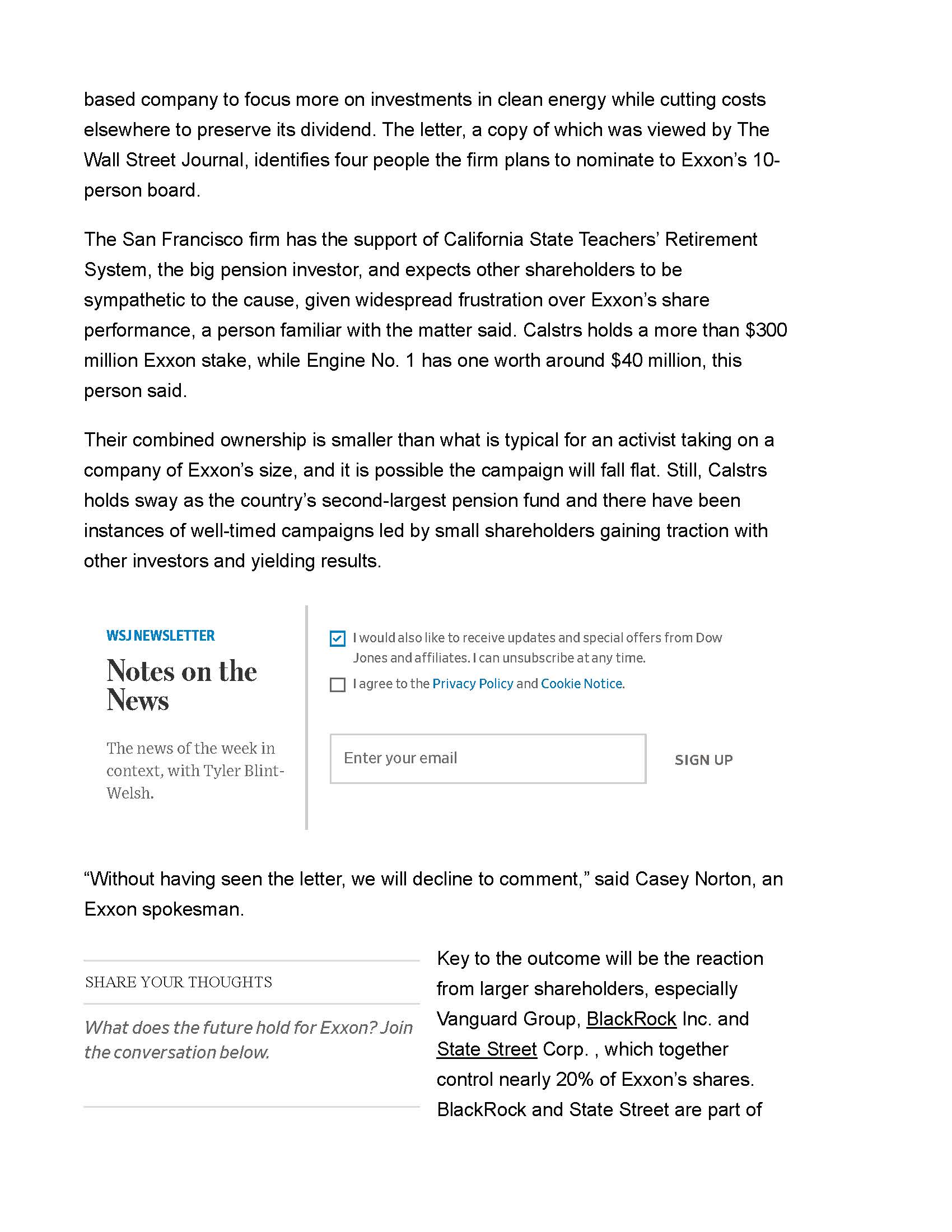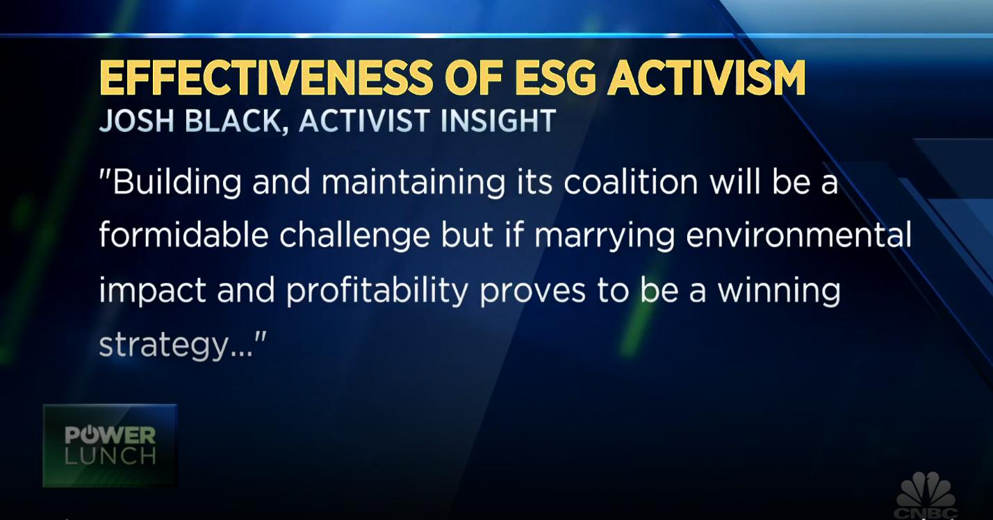 Leslie Picker: It used to be that ESG meant screening out companies that don't comply, but lately activist investors are screening in companies that would be the antithesis of ESG, like big oil and then pushing for changes. That's what's going on at Exxon right now. A new firm called Engine No. 1 led by an under the radar hedge fund manager, Chris James, is running a proxy fight seeking to overhaul the business by installing four directors to the board. Their bulk of their goal is to diversify the business into more clean energy while slashing costs elsewhere to ensure that that sacred dividend is protected. Now the 17-day old firm has just $250 million dollars in assets, mostly James's own money and its stake in Exxon is a nominal $40 million dollars or about .02% of Exxon's market cap but CalSTRS already supports the proposal and D.E. Shaw has reportedly built up a position and is pushing for similar demands as Engine No. 1. As Josh Black of Activist Insight puts it, "Building and maintaining its coalition of outside investors will be a formidable challenge but if marrying environmental impact and profitability proves to be a winning strategy, the next few years will see that convergence continue." In other words, expect more campaigns like this one in 2021.