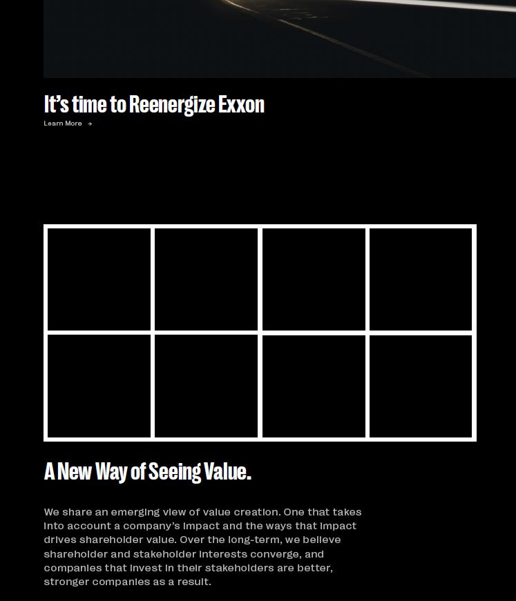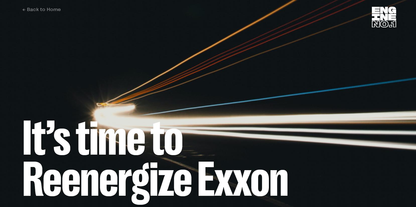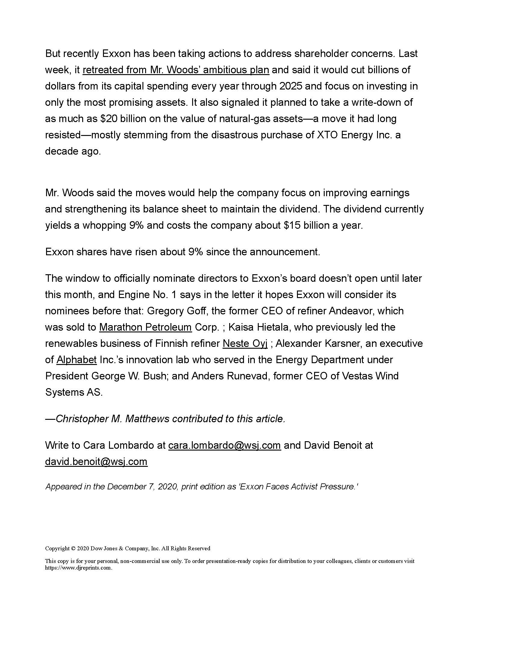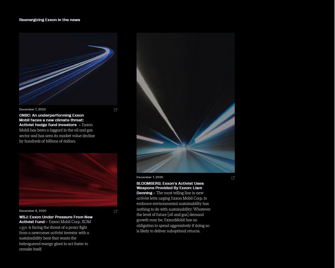 Engine No. 1 LLC added the following “splash” page to its website, www.engine1.com, which will be accessible to shareholders of Exxon Mobil Corporation. The splash page references certain third-party articles, which are reproduced below in their entirety in Exhibit 1 attached hereto. On December 17, 2020, CNBC's Power Lunch discussed Engine No. 1's efforts to effectuate change at Exxon Mobil Corp., a clip of which Engine No. 1 LLC may post to its websites www.ReenergizeXOM.com and www.engine1.com from time to time. A transcript of the clip and certain images from the clip are attached hereto as Exhibit 2. Attached hereto as Exhibit 3 is an updated biography of Anders Runevad that Engine No. 1 LLC posted to www.ReenergizeXOM.com.