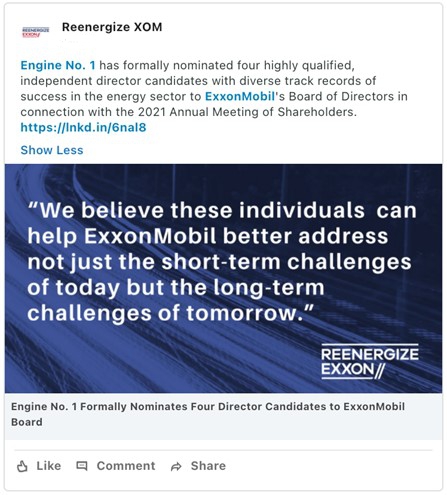 Exhibit 1 contains posts that, from time to time, Engine No. 1 LLC may make to its social media channels on Twitter and LinkedIn. |