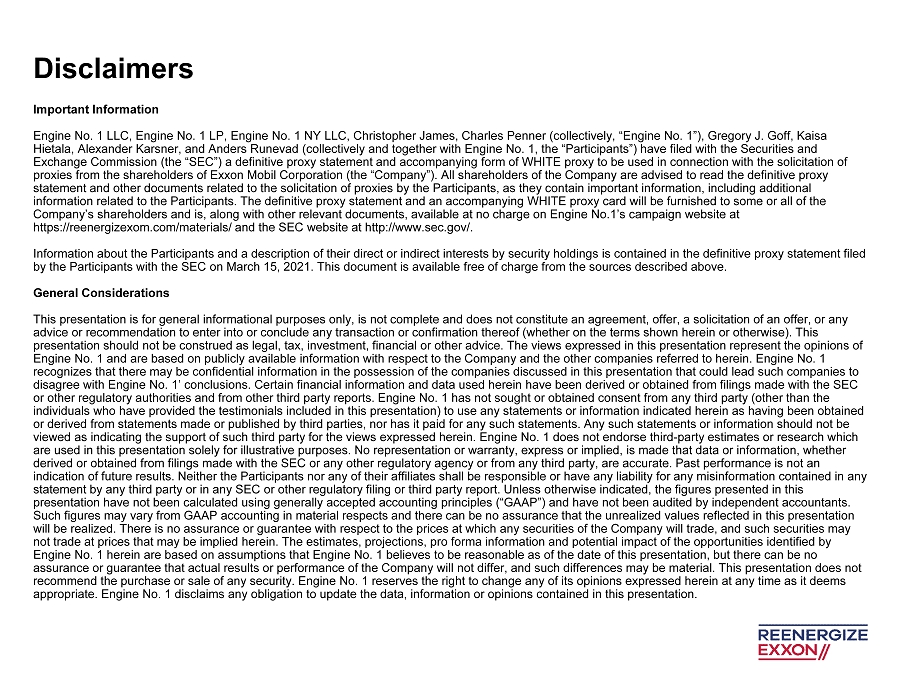 Disclaimers Important Information Engine No. 1 LLC, Engine No. 1 LP, Engine No. 1 NY LLC, Christopher James, Charles Penner (collectively, “Engine No. 1”), Gre gor y J. Goff, Kaisa Hietala, Alexander Karsner, and Anders Runevad (collectively and together with Engine No. 1, the “Participants”) have filed w ith the Securities and Exchange Commission (the “SEC”) a definitive proxy statement and accompanying form of WHITE proxy to be used in connection wi th the solicitation of proxies from the shareholders of Exxon Mobil Corporation (the “Company”). All shareholders of the Company are advised to read th e definitive proxy statement and other documents related to the solicitation of proxies by the Participants, as they contain important informati on, including additional information related to the Participants. The definitive proxy statement and an accompanying WHITE proxy card will be furnishe d t o some or all of the Company’s shareholders and is, along with other relevant documents, available at no charge on Engine No.1’s campaign website at https://reenergizexom.com/materials/ and the SEC website at http://www.sec.gov/. Information about the Participants and a description of their direct or indirect interests by security holdings is contained in the definitive proxy statement filed by the Participants with the SEC on March 15, 2021. This document is available free of charge from the sources described abov e. General Considerations This presentation is for general informational purposes only, is not complete and does not constitute an agreement, offer, a sol icitation of an offer, or any advice or recommendation to enter into or conclude any transaction or confirmation thereof (whether on the terms shown herein or otherwise). This presentation should not be construed as legal, tax, investment, financial or other advice. The views expressed in this presen tat ion represent the opinions of Engine No. 1 and are based on publicly available information with respect to the Company and the other companies referred to her ein. Engine No. 1 recognizes that there may be confidential information in the possession of the companies discussed in this presentation that cou ld lead such companies to disagree with Engine No. 1’ conclusions. Certain financial information and data used herein have been derived or obtained fro m f ilings made with the SEC or other regulatory authorities and from other third party reports. Engine No. 1 has not sought or obtained consent from any thi rd party (other than the individuals who have provided the testimonials included in this presentation) to use any statements or information indicated her ein as having been obtained or derived from statements made or published by third parties, nor has it paid for any such statements. Any such statements o r i nformation should not be viewed as indicating the support of such third party for the views expressed herein. Engine No. 1 does not endorse third - party e stimates or research which are used in this presentation solely for illustrative purposes. No representation or warranty, express or implied, is made th at data or information, whether derived or obtained from filings made with the SEC or any other regulatory agency or from any third party, are accurate. Past pe rformance is not an indication of future results. Neither the Participants nor any of their affiliates shall be responsible or have any liability fo r any misinformation contained in any statement by any third party or in any SEC or other regulatory filing or third party report. Unless otherwise indicated, the fig ures presented in this presentation have not been calculated using generally accepted accounting principles (“GAAP”) and have not been audited by in dep endent accountants. Such figures may vary from GAAP accounting in material respects and there can be no assurance that the unrealized values refl ect ed in this presentation will be realized. There is no assurance or guarantee with respect to the prices at which any securities of the Company will t rad e, and such securities may not trade at prices that may be implied herein. The estimates, projections, pro forma information and potential impact of the op portunities identified by Engine No. 1 herein are based on assumptions that Engine No. 1 believes to be reasonable as of the date of this presentation, bu t there can be no assurance or guarantee that actual results or performance of the Company will not differ, and such differences may be materia l. This presentation does not recommend the purchase or sale of any security. Engine No. 1 reserves the right to change any of its opinions expressed herei n a t any time as it deems appropriate. Engine No. 1 disclaims any obligation to update the data, information or opinions contained in this presentation .