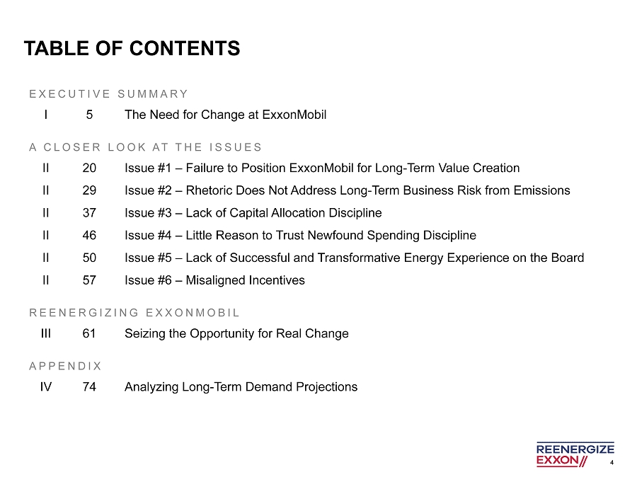TABLE OF CONTENTS EXECUTIVE SUMMARY I 5 The Need for Change at ExxonMobil A CLOSER LOOK AT THE ISSUES II 20 Issue #1 – Failure to Position ExxonMobil for Long - Term Value Creation II 29 Issue #2 – Rhetoric Does Not Address Long - Term Business Risk from Emissions II 37 Issue #3 – Lack of Capital Allocation Discipline II 46 Issue #4 – Little Reason to Trust Newfound Spending Discipline II 50 Issue #5 – Lack of Successful and Transformative Energy Experience on the Board II 57 Issue #6 – Misaligned Incentives REENERGIZING EXXONMOBIL III 61 Seizing the Opportunity for Real Change APPENDIX IV 74 Analyzing Long - Term Demand Projections 4