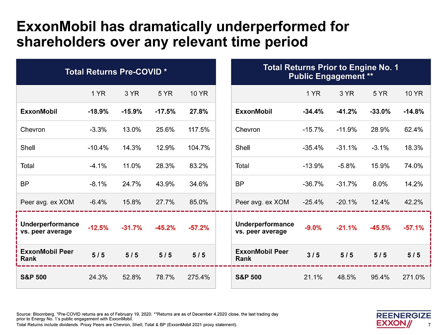 ExxonMobil has dramatically underperformed for shareholders over any relevant time period Source: Bloomberg. *Pre - COVID returns are as of February 19, 2020. **Returns are as of December 4,2020 close, the last trading d ay prior to Energy No. 1’s public engagement with ExxonMobil. Total Returns include dividends. Proxy Peers are Chevron, Shell, Total & BP (ExxonMobil 2021 proxy statement). Total Returns Pre - COVID * Total Returns Prior to Engine No. 1 Public Engagement ** 1 YR 3 YR 5 YR 10 YR 1 YR 3 YR 5 YR 10 YR ExxonMobil - 18.9% - 15.9% - 17.5% 27.8% ExxonMobil - 34.4% - 41.2% - 33.0% - 14.8% Chevron - 3.3% 13.0% 25.6% 117.5% Chevron - 15.7% - 11.9% 28.9% 62.4% Shell - 10.4% 14.3% 12.9% 104.7% Shell - 35.4% - 31.1% - 3.1% 18.3% Total - 4.1% 11.0% 28.3% 83.2% Total - 13.9% - 5.8% 15.9% 74.0% BP - 8.1% 24.7% 43.9% 34.6% BP - 36.7% - 31.7% 8.0% 14.2% Peer avg. ex XOM - 6.4% 15.8% 27.7% 85.0% Peer avg. ex XOM - 25.4% - 20.1% 12.4% 42.2% Underperformance vs. peer average - 12.5% - 31.7% - 45.2% - 57.2% Underperformance vs. peer average - 9.0% - 21.1% - 45.5% - 57.1% ExxonMobil Peer Rank 5 / 5 5 / 5 5 / 5 5 / 5 ExxonMobil Peer Rank 3 / 5 5 / 5 5 / 5 5 / 5 S&P 500 24.3% 52.8% 78.7% 275.4% S&P 500 21.1% 48.5% 95.4% 271.0% 7