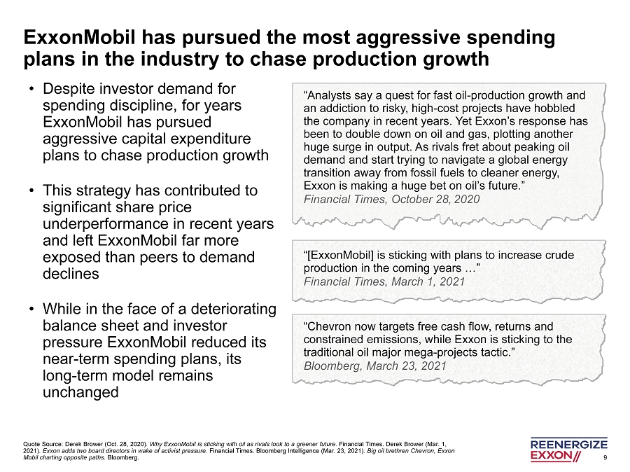 This decline occurred while oil and gas are still the dominant forms of global energy Source: Company 10Ks and Bloomberg. All share price, total shareholder returns, and market capitalization figures for ExxonMo bil are as of the last date prior to Engine #1’s public engagement, December 4, 2020, unless otherwise noted. CFO is annual Cash Flow from Operations, prior to ca pital expenditures. 2010 2015 2020* Market Capitalization Largest company in the World at ~$370 bn market cap; #1 in the Dow Jones ~$370 billion market capitalization; #3 company in the Dow Jones Removed from DJIA. ~$250 billion market cap pre - COVID / ~$176 billon pre - Engine No. 1 engagement. S&P Credit Rating AAA AAA Downgraded three times (twice pre - COVID) by S&P and put on negative outlook Balance Sheet Net Debt: $7 bn Net Debt / CFO: 0.15 x Net Debt: $39 bn Net Debt / CFO: 1.8x Net Debt: $63bn Net Debt / CFO: 4.0x Dividend Capability Consistent dividend growth. Total of $163bn returned over 2005 - 2010 including share buybacks. Free Cash generated covered dividend by over 2 times 37 straight years of dividend increases Free Cash flow fell short of dividend by over $20bn from 2017 - 2020, forcing the Company to borrow to pay the dividend 8