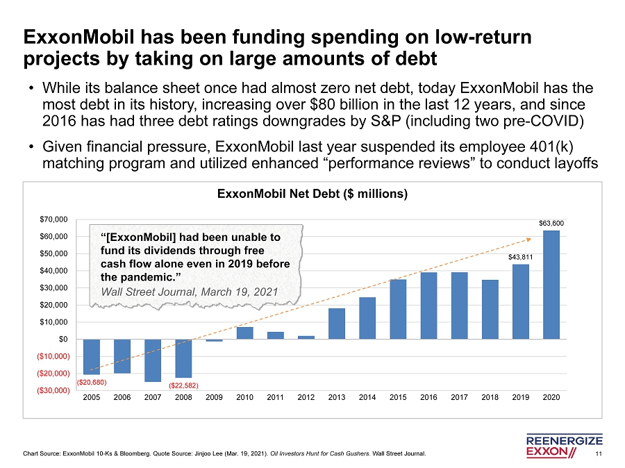 Board’s strategy eroded shareholder value before COVID, and left ExxonMobil far more vulnerable • Irresponsible spending resulted in ExxonMobil having the highest oil break - even price of any of its peers, leaving it more vulnerable to drops in demand Source: JP Morgan research; breakeven prices are post - dividend. Pre - COVID data is as of January 31, 2020 for US peers and Decem ber 6, 2019 for European peers. $ / bbl Breakeven Oil Price $62 $52 $46 $61 $62 $84 $57 $58 $67 $65 $87 $58 $47 $56 $60 $30 $50 $70 $90 ExxonMobil Chevron BP Shell Total 2018 2019 2020 (Pre-COVID) 10