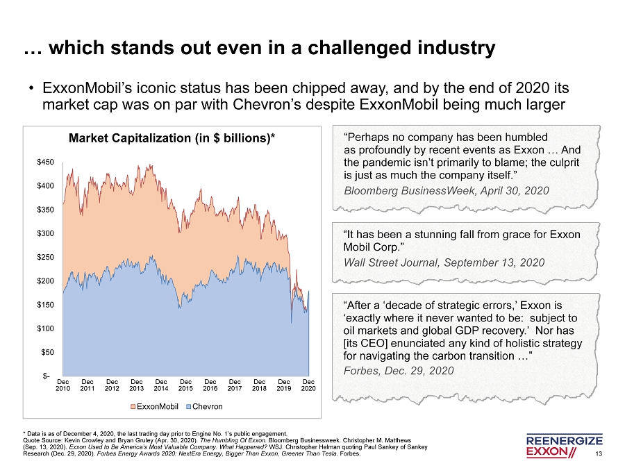 … which stands out even in a challenged industry * Data is as of December 4, 2020, the last trading day prior to Engine No. 1’s public engagement. Quote Source: Kevin Crowley and Bryan Gruley (Apr. 30, 2020). The Humbling Of Exxon. Bloomberg Businessweek. Christopher M. Matthews (Sep. 13, 2020). Exxon Used to Be America’s Most Valuable Company. What Happened? WSJ . Christopher Helman quoting Paul Sankey of Sankey Research (Dec. 29, 2020). Forbes Energy Awards 2020: NextEra Energy, Bigger Than Exxon, Greener Than Tesla. Forbes. Market Capitalization (in $ billions)* $- $50 $100 $150 $200 $250 $300 $350 $400 $450 ExxonMobil Chevron Dec 2010 Dec 2011 Dec 2012 Dec 2013 Dec 2014 Dec 2015 Dec 2016 Dec 2017 Dec 2018 Dec 2019 Dec 2020 “After a ‘decade of strategic errors,’ Exxon is ‘exactly where it never wanted to be: subject to oil markets and global GDP recovery.’ Nor has [its CEO] enunciated any kind of holistic strategy for navigating the carbon transition …” Forbes, Dec. 29, 2020 “It has been a stunning fall from grace for Exxon Mobil Corp.” Wall Street Journal, September 13, 2020 “Perhaps no company has been humbled as profoundly by recent events as Exxon … And the pandemic isn’t primarily to blame; the culprit is just as much the company itself.” Bloomberg BusinessWeek, April 30, 2020 • ExxonMobil’s iconic status has been chipped away, and by the end of 2020 its market cap was on par with Chevron’s despite ExxonMobil being much larger 13
