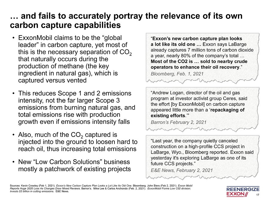 ExxonMobil paints an unrealistic picture of the likelihood that carbon capture will obviate the need for change ... • It is true that the IPCC and IEA have said that carbon capture is critical for a 2  C pathway, but they have made clear that it is not a substitute for dramatically reducing conventional fossil fuel usage • While ExxonMobil has trumpeted carbon capture, its actual carbon captured has changed little • All of the world’s existing carbon capture projects can capture less than 0.1% of global emissions • Projects to reduce Scope 3 emissions are incredibly costly and prone to failure, and heavily dependent upon government subsidies ExxonMobil’s Carbon Capture of 6.8Mn tons is <1% of its Annual Emissions of 690Mn tons of CO2 Quote Source: IEA. Going Carbon Negative: What Are the Technology Options? (January 31, 2020) Sources: Chart and Table Source: ExxonMobil 2021 Energy and Carbon Summary. 2014 2015 2016 2017 2018 2019 CO2 captured for storage by ExxonMobil 6.9 6.9 6.3 6.6 7.0 6.8 120 570 6.8 Scope 1 & 2 Scope 3 Carbon Captured (in million metric tons of CO2 eq. per year) 16 • In short, even the most advanced carbon capture is highly unlikely to enable ExxonMobil to avoid transforming its business model over the long - term “It is important to note that carbon removal technologies are not an alternative to cutting emissions or an excuse for delayed action. ” – International Energy Agency (IEA) (2020)