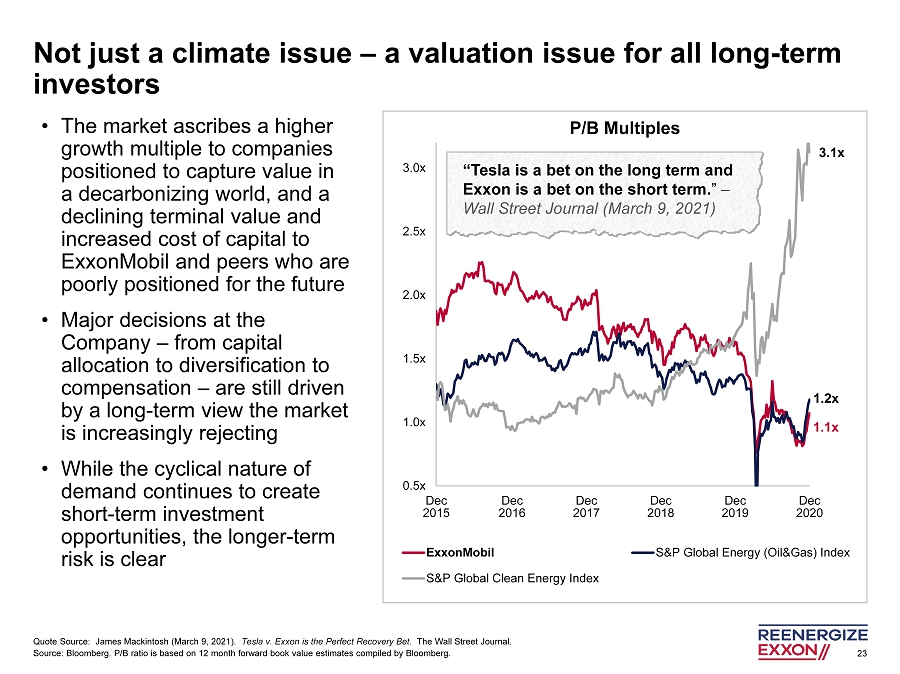 Not just a climate issue – a valuation issue for all long - term investors • The market ascribes a higher growth multiple to companies positioned to capture value in a decarbonizing world, and a declining terminal value and increased cost of capital to ExxonMobil and peers who are poorly positioned for the future • Major decisions at the Company – from capital allocation to diversification to compensation – are still driven by a long - term view the market is increasingly rejecting • While the cyclical nature of demand continues to create short - term investment opportunities, the longer - term risk is clear Quote Source: James Mackintosh (March 9, 2021). Tesla v. Exxon is the Perfect Recovery Bet. The Wall Street Journal. Source: Bloomberg. P/B ratio is based on 12 month forward book value estimates compiled by Bloomberg. 23 1.1x 1.2x 3.1x 0.5x 1.0x 1.5x 2.0x 2.5x 3.0x ExxonMobil S&P Global Energy (Oil&Gas) Index S&P Global Clean Energy Index Dec 2015 Dec 2016 Dec 2017 Dec 2018 Dec 2019 Dec 2020 P/B Multiples “Tesla is a bet on the long term and Exxon is a bet on the short term . ” – Wall Street Journal (March 9, 2021)