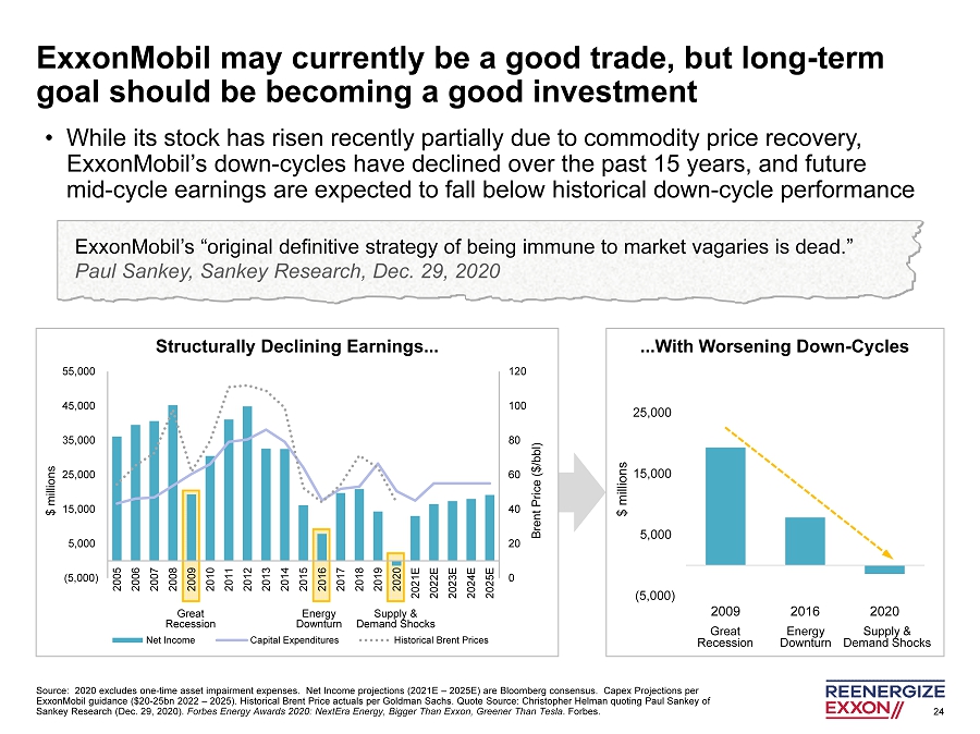 ExxonMobil may currently be a good trade, but long - term goal should be becoming a good investment 24 Source: 2020 excludes one - time asset impairment expenses. Net Income projections (2021E – 2025E) are Bloomberg consensus. Cap ex Projections per ExxonMobil guidance ($20 - 25bn 2022 – 2025). Historical Brent Price actuals per Goldman Sachs. Quote Source: Christopher Helman q uoting Paul Sankey of Sankey Research (Dec. 29, 2020). Forbes Energy Awards 2020: NextEra Energy, Bigger Than Exxon, Greener Than Tesla . Forbes. Structurally Declining Earnings... ...With Worsening Down - Cycles Great Recession Energy Downturn Supply & Demand Shocks (5,000) 5,000 15,000 25,000 2009 2016 2020 $ millions Great Recession Energy Downturn Supply & Demand Shocks 0 20 40 60 80 100 120 (5,000) 5,000 15,000 25,000 35,000 45,000 55,000 2005 2006 2007 2008 2009 2010 2011 2012 2013 2014 2015 2016 2017 2018 2019 2020 2021E 2022E 2023E 2024E 2025E Net Income Capital Expenditures Historical Brent Prices Brent Price ($/bbl) $ millions ExxonMobil’s “original definitive strategy of being immune to market vagaries is dead.” Paul Sankey, Sankey Research, Dec. 29, 2020 • While its stock has risen recently partially due to commodity price recovery, ExxonMobil’s down - cycles have declined over the past 15 years, and future mid - cycle earnings are expected to fall below historical down - cycle performance