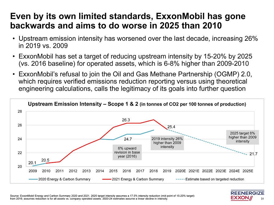 ExxonMobil has sought to obscure long - term risk by distorting its long - term emissions trajectory • While in the past ExxonMobil sought to disrupt the work of Intergovernmental Panel on Climate Change (IPCC), today it seeks to distort the meaning of its work • Arguing that reducing emissions intensity (emissions per unit produced), while ExxonMobil continues to pursue production growth and thus increases overall emissions, puts it on a “Paris consistent” path fails the basic test of logic Source for first bullet: “Exxon states that it has ‘participated in the [IPCC] since its inception in 1988.’ … A primary goa l w as to undermine the IPCC process, sending large delegations to IPCC meetings, targeting IPCC scientists with accusations of ‘scientific cleansing,’ and cherry - pic king data to suggest warming might simply be ’part of a natural warming trend which began nearly 400 years ago.’” (Kate Aronoff (January 8, 2021). ExxonMobil is Twisting Itself in Knots to Justify Pumping Even More Oil. The New Republic) Note: 2025E GHG Emissions per Engine No. 1 estimate across Scope 1 & 2 on a net equity basis with Scope 3 per the IPIECA Category 11 methodology. Assumes 2025E production of ~3.99mm boe/d and gas versus liquids split per March 2021 Wall Street re sea rch model. 30 -100% -75% -50% -25% 0% 25% 2016 2020 2025 2050 2070 GHG Emissions Indexed to 2016 2  C Pathway 1.5  C Pathway 1.5  C Pathway 2025E Society’s Emissions Claimed GHG Emissions (Operated Production and Scope1&2 Only) Reality : Looking at ExxonMobil’s total carbon emissions trajectory highlights long - term risk to investors in a decarbonizing world Net Zero ExxonMobil’s Claimed GHG Emissions Trajectory Versus Reality