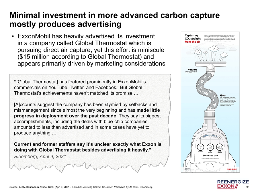 Minimal investment in more advanced carbon capture mostly produces advertising • ExxonMobil has heavily advertised its investment in a company called Global Thermostat which is pursuing direct air capture, yet this effort is miniscule ($15 million according to Global Thermostat) and appears primarily driven by marketing considerations “ [Global Thermostat] has featured prominently in ExxonMobil’s commercials on YouTube, Twitter, and Facebook. But Global Thermostat’s achievements haven’t matched its promise … [A] ccounts suggest the company has been stymied by setbacks and mismanagement since almost the very beginning and has made little progress in deployment over the past decade . They say its biggest accomplishments, including the deals with blue - chip companies, amounted to less than advertised and in some cases have yet to produce anything … Current and former staffers say it’s unclear exactly what Exxon is doing with Global Thermostat besides advertising it heavily. ” Bloomberg, April 9, 2021 32 Source: Leslie Kaufman & Akshat Rathi (Apr. 9, 2021). A Carbon - Sucking Startup Has Been Paralyzed by Its CEO . Bloomberg.