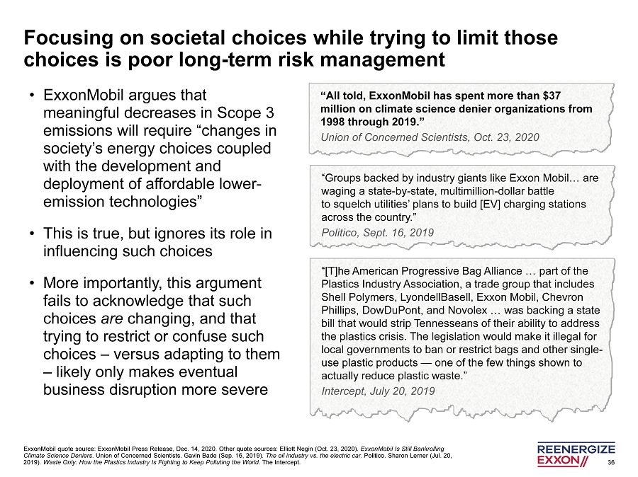 A decade of advertising about algae biofuels despite lack of viability shows a similar focus on advertising over reality • ExxonMobil has touted algae biofuels for more than a decade, yet has little to demonstrate for it other than advertising (during this same time period, one of our nominees helped build the world’s largest renewable diesel and jet fuel business) • Its most recent goal of producing 10,000 barrels by 2025 is ~0.02% of ExxonMobil’s refining capacity Sources: Haley Zaremba (January 28, 2020). Does Exxon Know Something About Biofuel That Its Peers Don’t? Oilprice.com. 2010 Super Bowl Commercial retrieved from https://www.youtube.com/watch?v=TFR - 1ltqkcA. 2020 Super Bowl commercial retrieved from https://www.ispot.tv/ad/ovGn/exxon - m obil - algae - potential. 35 2020 ExxonMobil TV Commercial “ExxonMobil is growing algae for biofuels that could one day power planes, propel ships, and fuel trucks, and cut their emissions in half. Algae ... Its potential just keeps growing.” 2010 ExxonMobil TV Commercial “Algae are amazing little critters … We’re hoping to supplement the fuels that we use in our vehicles and to do this at large enough scale to some day help meet the world’s energy demands.” “ In the midst of all these companies abandoning the algal biofuel mission, however, one company has held strong to its ambitions and promises within the sector. That company is ExxonMobil … These promises, however, should be taken with a sizeable grain of salt. Most of their biofuel announcements come in the form of vague PR - bait and social media posturing.” Oilprice.com , January 28, 2020
