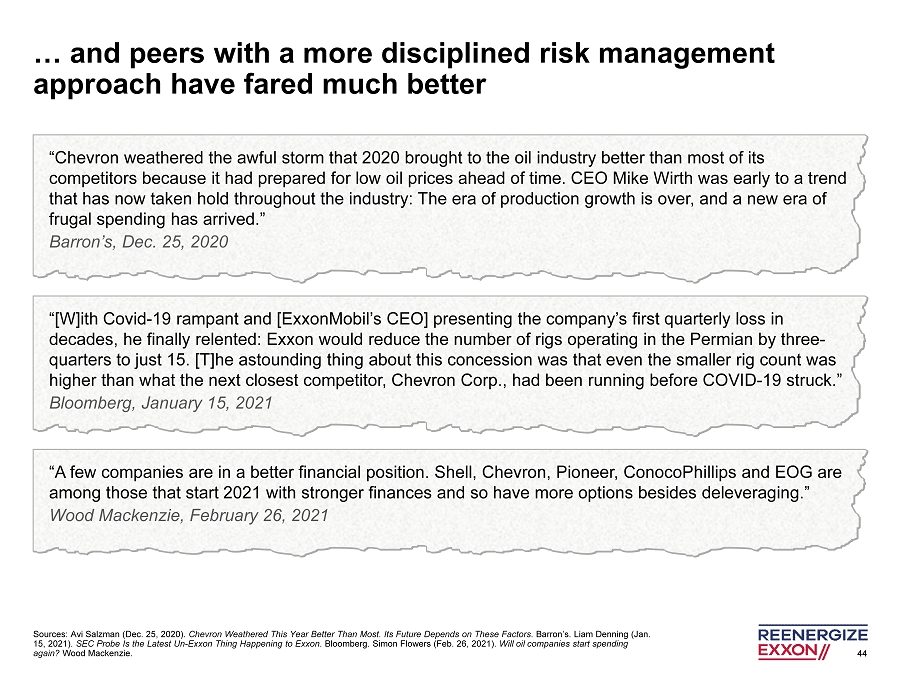 … and peers with a more disciplined risk management approach have fared much better “[W] ith Covid - 19 rampant and [ExxonMobil’s CEO] presenting the company’s first quarterly loss in decades, he finally relented: Exxon would reduce the number of rigs operating in the Permian by three - quarters to just 15. [T]he astounding thing about this concession was that even the smaller rig count was higher than what the next closest competitor, Chevron Corp., had been running before COVID - 19 struck.” Bloomberg, January 15, 2021 “Chevron weathered the awful storm that 2020 brought to the oil industry better than most of its competitors because it had prepared for low oil prices ahead of time. CEO Mike Wirth was early to a trend that has now taken hold throughout the industry: The era of production growth is over, and a new era of frugal spending has arrived.” Barron’s, Dec. 25, 2020 Sources: Avi Salzman (Dec. 25, 2020). Chevron Weathered This Year Better Than Most. Its Future Depends on These Factors . Barron’s. Liam Denning (Jan. 15, 2021). SEC Probe Is the Latest Un - Exxon Thing Happening to Exxon . Bloomberg. Simon Flowers (Feb. 26, 2021). Will oil companies start spending again? Wood Mackenzie. 44 “A few companies are in a better financial position. Shell, Chevron, Pioneer, ConocoPhillips and EOG are among those that start 2021 with stronger finances and so have more options besides deleveraging.” Wood Mackenzie, February 26, 2021