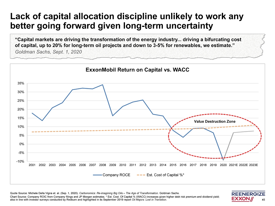 Lack of capital allocation discipline unlikely to work any better going forward given long - term uncertainty Quote Source: Michele Della Vigna et. al. (Sep. 1, 2020). Carbonomics: Re - imagining Big Oils – The Age of Transformation . Goldman Sachs. Chart Source: Company ROIC from Company filings and JP Morgan estimates. * Est. Cost. Of Capital % (WACC) increases given hig her debt risk premium and dividend yield; also in line with investor surveys conducted by Redburn and highlighted in its September 2019 report Oil Majors: Lost in Transition . “Capital markets are driving the transformation of the energy industry... driving a bifurcating cost of capital, up to 20% for long - term oil projects and down to 3 - 5% for renewables, we estimate.” Goldman Sachs, Sept. 1, 2020 -10% -5% 0% 5% 10% 15% 20% 25% 30% 35% 2001 2002 2003 2004 2005 2006 2007 2008 2009 2010 2011 2012 2013 2014 2015 2016 2017 2018 2019 2020 2021E 2022E 2023E Company ROCE Est. Cost of Capital %* Value Destruction Zone ExxonMobil Return on Capital vs. WACC 45
