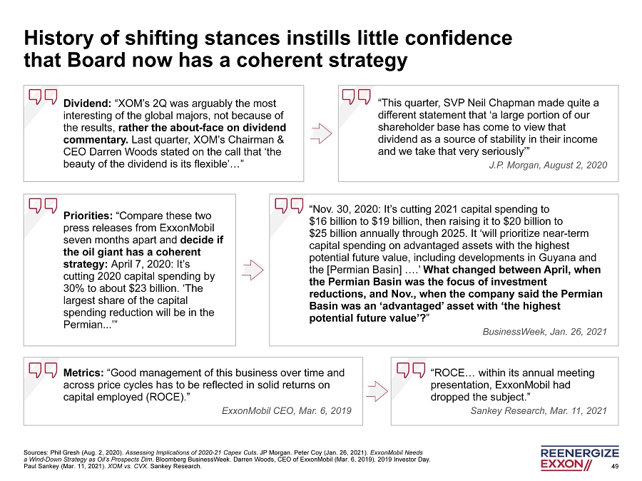 We believe shareholders need a Board that will maintain a consistent strategy of capital allocation discipline • While presented with great fanfare, ExxonMobil’s near - term spending cuts came as little surprise to analysts given ExxonMobil’s deteriorating financial position Table Source: S&P Capital IQ annual capex estimates as of 9/30/2020. Quote sources: Phil Gresh (Nov. 30, 2020). Thoughts on Guidance Update . JP Morgan. Phil Gresh (Jan. 19, 2021). Investor Feedback on Our Upgrade . JP Morgan. Jeanine Wai (Feb. 26, 2021). Why There’s Still Legs Beyond the Current Crude Rally . Barclays. • After our campaign began, ExxonMobil further embraced the language of spending discipline and even abandoned near - term production growth targets • However, the history that preceded this creates serious doubt, as does ExxonMobil’s continued adherence to a strategy solely predicated on long - term growth in oil and gas Company’s Capex Cuts vs Pre - Existing Analyst Estimates 2021 2022 2023 2024 2025 9/30/20 Wall Street Estimates 17,000 20,769 21,236 20,349 19,442 11/30/20 Mid - Point XOM Guidance 17,500 22,500 22,500 22,500 22,500 “All in, we think that the … capex guidance [is] not too surprising...” JP Morgan, Nov. 30, 2020 “[M]ost investors are uncertain as to whether XOM will stick to the $20 - 25B long - term budget in a higher … price environment.” JP Morgan, Jan. 19, 2021 “Despite the cuts, XOM continues ahead with much the same slate of longer - term growth projects in place.” Barclays, Feb. 26, 2021 48
