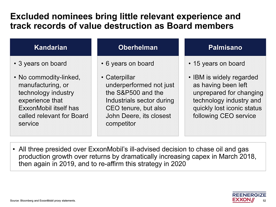ExxonMobil has for years filled its Board with former CEOs without any energy experience Source: Bloomberg and ExxonMobil proxy statements. *Sector Return is S&P's GICS Level 1 Sector return for the respective comp any ; Market Return is the S&P 500 return for the same tenure. Performance of Ken Frazier (currently CEO at Merck) is measured through 4/9/2021. 22% 34% 22% 11% 11% Information Technology Financials Climate Scientist Healthcare Industrials ExxonMobil Board Independent Director Industry Experience Pre - Engine No. 1 Engagement • While large cap CEO experience is helpful as part of the overall board mix, transferable skills and track records of performance should matter as well 51 Current Independent Director Nominee Track Record as CEOs Director Company CEO Tenure Stock Total Return Sector Return* Market Return* Frazier Merck 12/2011 Present 192% 316% 301% Burns Xerox Holdings 7/2009 12/2016 55% 190% 181% Palmisano IBM 3/2002 12/2011 103% 36% 35% Oberhelman Caterpillar 7/2010 12/2016 85% 163% 150% Braly Anthem 6/2007 8/2012 - 28% 18% 3% Hooley State Street 3/2010 12/2018 63% 134% 170% Kandarian MetLife 5/2011 4/2019 40% 146% 155%