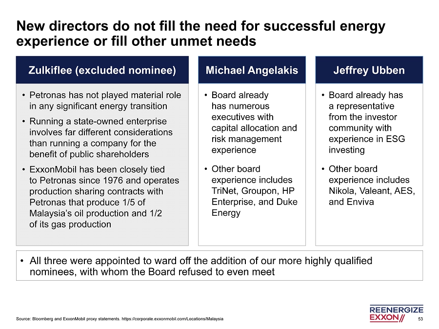 • Board already has a representative from the investor community with experience in ESG investing • Other board experience includes Nikola, Valeant, AES, and Enviva • Board already has numerous executives with capital allocation and risk management experience • Other board experience includes TriNet , Groupon, HP Enterprise, and Duke Energy New directors do not fill the need for successful energy experience or fill other unmet needs • All three were appointed to ward off the addition of our more highly qualified nominees, with whom the Board refused to even meet • Petronas has not played material role in any significant energy transition • Running a state - owned enterprise involves far different considerations than running a company for the benefit of public shareholders • ExxonMobil has been closely tied to Petronas since 1976 and operates production sharing contracts with Petronas that produce 1/5 of Malaysia’s oil production and 1/2 of its gas production Jeffrey Ubben Zulkiflee (excluded nominee) Michael Angelakis 53 Source: Bloomberg and ExxonMobil proxy statements. https://corporate.exxonmobil.com/Locations/Malaysia