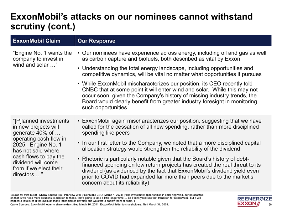 ExxonMobil’s attacks on our nominees cannot withstand scrutiny ExxonMobil Claim Our Response “Two of the candidates don’t have CEO experience at any company …” • The Board has long used having held the CEO role in an unrelated industry as primary criteria, despite a decade of underperformance • Following our campaign, ExxonMobil itself added three new board members with no public company CEO experience • Two of our nominees do have prior CEO experience and ExxonMobil still refused to even meet them, undermining the credibility of this excuse “None of Engine No. 1’s candidates have experience at companies even close to the complexity or scale of ExxonMobil.” • Successful track records and transferability of skill sets matter as much as experience with large companies in completely unrelated industries • None of our nominees are expected to recreate their prior executive roles, just as no one on the Board is expected to develop new drugs • Generating outsized returns in energy and demonstrating industry foresight are highly transferable skills and highly valuable for a Board that has demonstrated neither ability for over a decade, including missing industry trends such as the shale revolution, the shift to focusing on project returns over chasing production growth, and the need to gradually prepare for rather than ignore the energy transition • Even on its face this argument falls flat given current Board composition: Anthem (~$19B market cap at end of tenure of CEO now on Board), State Street (~$24B), Xerox (~$7B) vs. Andeavor (acquired for $23B), Neste (~$26B in 2019, now ~$40B), Vestas (~$18B in 2019, now ~$46B) Quote Sources: ExxonMobil letter to shareholders, filed March 31, 2001. 55