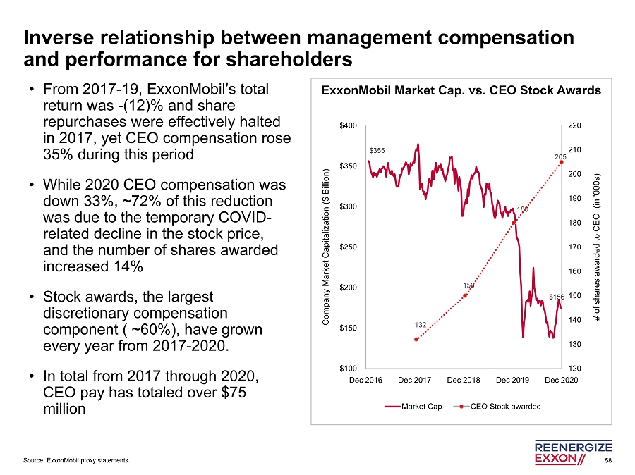 Inverse relationship between management compensation and performance for shareholders • From 2017 - 19, ExxonMobil’s total return was - (12)% and share repurchases were effectively halted in 2017, yet CEO compensation rose 35% during this period • While 2020 CEO compensation was down 33%, ~72% of this reduction was due to the temporary COVID - related decline in the stock price, and the number of shares awarded increased 14% • Stock awards, the largest discretionary compensation component ( ~60%), have grown every year from 2017 - 2020. • In total from 2017 through 2020, CEO pay has totaled over $75 million Source: ExxonMobil proxy statements. 58 ExxonMobil Market Cap. vs. CEO Stock Awards $355 $156 132 150 180 205 120 130 140 150 160 170 180 190 200 210 220 $100 $150 $200 $250 $300 $350 $400 Market Cap CEO Stock awarded Company Market Capitalization ($ Billion) # of shares awarded to CEO (in '000s) Dec 2016 Dec 2017 Dec 2018 Dec 2019 Dec 2020
