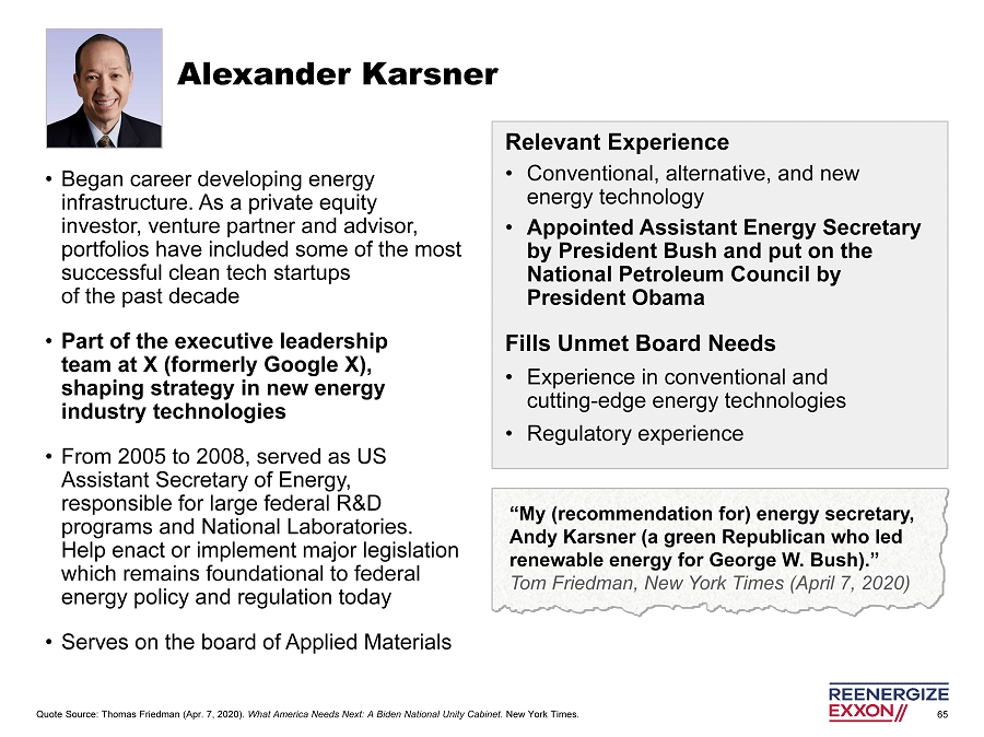 Alexander Karsner • Began career developing energy infrastructure. As a private equity investor, venture partner and advisor, portfolios have included some of the most successful clean tech startups of the past decade • Part of the executive leadership team at X (formerly Google X), shaping strategy in new energy industry technologies • From 2005 to 2008, served as US Assistant Secretary of Energy, responsible for large federal R&D programs and National Laboratories. Help enact or implement major legislation which remains foundational to federal energy policy and regulation today • Serves on the board of Applied Materials “My (recommendation for) energy secretary, Andy Karsner (a green Republican who led renewable energy for George W. Bush).” Tom Friedman, New York Times (April 7, 2020) Relevant Experience • Conventional, alternative, and new energy technology • Appointed Assistant Energy Secretary by President Bush and put on the National Petroleum Council by President Obama Fills Unmet Board Needs • Experience in conventional and cutting - edge energy technologies • Regulatory experience 65 Quote Source: Thomas Friedman (Apr. 7, 2020). What America Needs Next: A Biden National Unity Cabinet. New York Times.