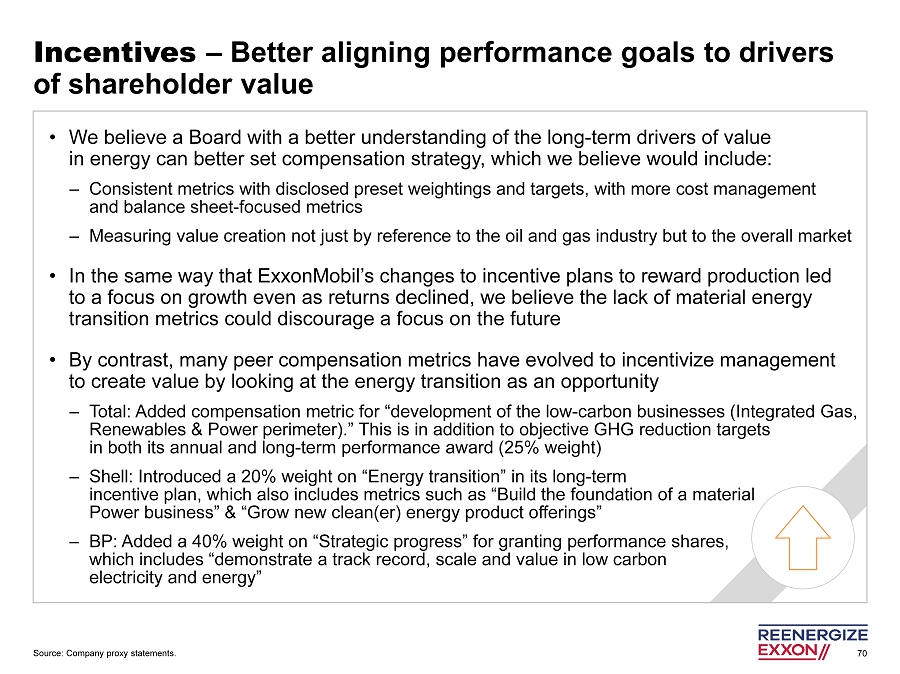 Incentives – Better aligning performance goals to drivers of shareholder value • We believe a Board with a better understanding of the long - term drivers of value in energy can better set compensation strategy, which we believe would include: – Consistent metrics with disclosed preset weightings and targets, with more cost management and balance sheet - focused metrics – Measuring value creation not just by reference to the oil and gas industry but to the overall market • In the same way that ExxonMobil’s changes to incentive plans to reward production led to a focus on growth even as returns declined, we believe the lack of material energy transition metrics could discourage a focus on the future • By contrast, many peer compensation metrics have evolved to incentivize management to create value by looking at the energy transition as an opportunity – Total: Added compensation metric for “development of the low - carbon businesses (Integrated Gas, Renewables & Power perimeter).” This is in addition to objective GHG reduction targets in both its annual and long - term performance award (25% weight) – Shell: Introduced a 20% weight on “Energy transition” in its long - term incentive plan, which also includes metrics such as “Build the foundation of a material Power business” & “Grow new clean(er) energy product offerings” – BP: Added a 40% weight on “Strategic progress” for granting performance shares, which includes “demonstrate a track record, scale and value in low carbon electricity and energy” 70 Source: Company proxy statements.