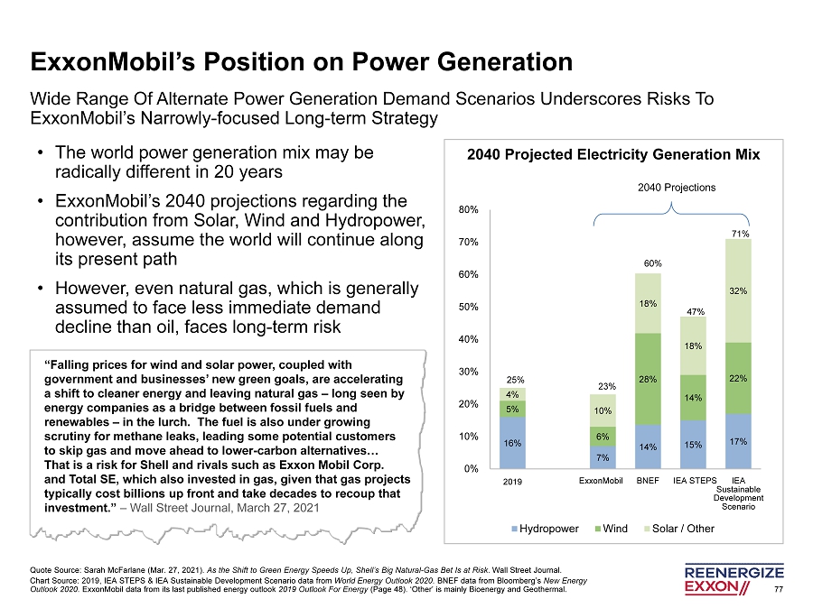 ExxonMobil’s Position on Power Generation • The world power generation mix may be radically different in 20 years • ExxonMobil’s 2040 projections regarding the contribution from Solar, Wind and Hydropower, however, assume the world will continue along its present path • However, even natural gas, which is generally assumed to face less immediate demand decline than oil, faces long - term risk Wide Range Of Alternate Power Generation Demand Scenarios Underscores Risks To ExxonMobil’s Narrowly - focused Long - term Strategy “Falling prices for wind and solar power, coupled with government and businesses’ new green goals, are accelerating a shift to cleaner energy and leaving natural gas – long seen by energy companies as a bridge between fossil fuels and renewables – in the lurch. The fuel is also under growing scrutiny for methane leaks, leading some potential customers to skip gas and move ahead to lower - carbon alternatives… That is a risk for Shell and rivals such as Exxon Mobil Corp. and Total SE, which also invested in gas, given that gas projects typically cost billions up front and take decades to recoup that investment.” – Wall Street Journal, March 27, 2021 Quote Source: Sarah McFarlane (Mar. 27, 2021). As the Shift to Green Energy Speeds Up, Shell’s Big Natural - Gas Bet Is at Risk . Wall Street Journal. Chart Source: 2019, IEA STEPS & IEA Sustainable Development Scenario data from World Energy Outlook 2020 . BNEF data from Bloomberg’s New Energy Outlook 2020 . ExxonMobil data from its last published energy outlook 2019 Outlook For Energy (Page 48). ‘Other’ is mainly Bioenergy and Geothermal. 2040 Projected Electricity Generation Mix 16% 7% 14% 15% 17% 5% 6% 28% 14% 22% 4% 10% 18% 18% 32% 25% 23% 60% 47% 71% 0% 10% 20% 30% 40% 50% 60% 70% 80% Hydropower Wind Solar / Other 2040 Projections 2019 ExxonMobil BNEF IEA STEPS IEA Sustainable Development Scenario 77