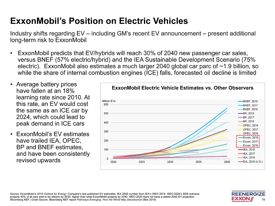 ExxonMobil’s Position on Electric Vehicles • Average battery prices have fallen at an 18% learning rate since 2010. At this rate, an EV would cost the same as an ICE car by 2024, which could lead to peak demand in ICE cars • ExxonMobil’s EV estimates have trailed IEA, OPEC, BP and BNEF estimates, and have been consistently revised upwards Industry shifts regarding EV – including GM’s recent EV announcement – present additional long - term risk to ExxonMobil • ExxonMobil predicts that EV/hybrids will reach 30% of 2040 new passenger car sales, versus BNEF (57% electric/hybrid) and the IEA Sustainable Development Scenario (75% electric). ExxonMobil also estimates a much larger 2040 global car parc of ~1.9 billion, so while the share of internal combustion engines (ICE) falls, forecasted oil decline is limited Source: ExxonMobil’s 2019 Outlook for Energy , Company’s last published EV estimates. IEA 2040 number from IEA’s WEO 2019. WEO 2020’s SDS scenario projects 40% of all cars sold to be electric by 2030, higher than what ExxonMobil projects by 2040. WEO 2020 does not have a sta ted 2040 EV projection. Bloomberg NEF | Chart Source: Bloomberg NEF report Pathways Emerging: How the World May Decarbonize (Mar 2019) ExxonMobil Electric Vehicle Estimates vs. Other Observers 79