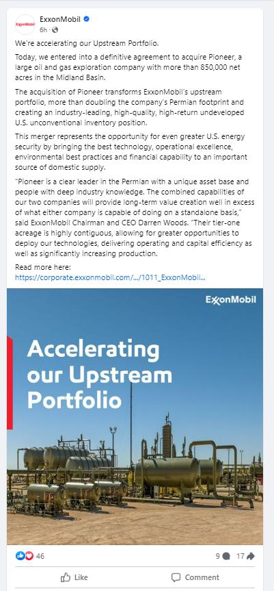 The following communication was posted on Facebook, by Exxon Mobil Corporation on October 11, 2023: