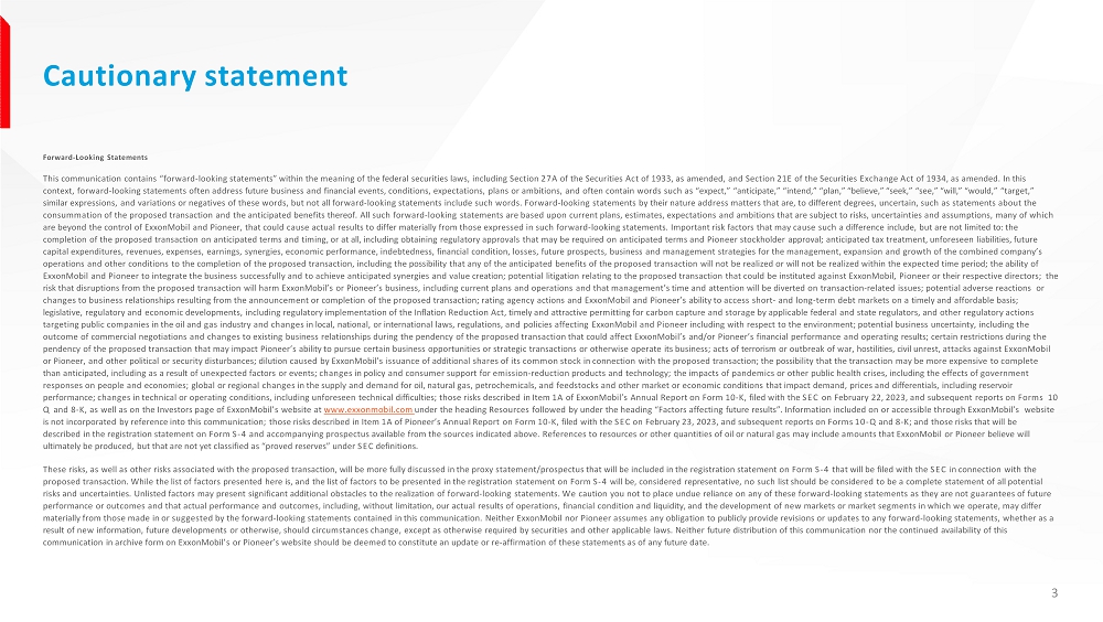 Cautionary statement 2 Important Information about the Transaction and Where to Find It In connection with the proposed transaction between Exxon Mobil Corporation (“ExxonMobil”) and Pioneer Natural Resources Company (“Pioneer”), ExxonMobil and Pioneer will file relevant materials with the Securities and Exchange Commission (the “SEC”), including a registration statement on Form S - 4 filed by ExxonMobil that will include a proxy statement of Pioneer that also constitutes a prospectus of ExxonMobil. A definitive proxy statement/prospectus will be mailed to stockholders of Pioneer. This communication is not a substitute for the registration statement, proxy statement or prospectus or any other document that ExxonMobil or Pioneer (as applicable) may file with the SEC in connection with the proposed transaction. BEFORE MAKING ANY VOTING OR INVESTMENT DECISION, INVESTORS AND SECURITY HOLDERS OF EXXONMOBIL AND PIONEER ARE URGED TO READ THE REGISTRATION STATEMENT, THE PROXY STATEMENT/PROSPECTUS AND ANY OTHER RELEVANT DOCUMENTS THAT ARE FILED OR WILL BE FILED WITH THE SEC, AS WELL AS ANY AMENDMENTS OR SUPPLEMENTS TO THESE DOCUMENTS, CAREFULLY AND IN THEIR ENTIRETY WHEN THEY BECOME AVAILABLE BECAUSE THEY CONTAIN OR WILL CONTAIN IMPORTANT INFORMATION ABOUT THE PROPOSED TRANSACTION AND RELATED MATTERS . Investors and security holders may obtain free copies of the registration statement and the proxy statement/prospectus (when they become available), as well as other filings containing important information about ExxonMobil or Pioneer, without charge at the SEC’s Internet website ( http : //www . sec . gov ) . Copies of the documents filed with the SEC by ExxonMobil will be available free of charge on ExxonMobil’s internet website at www . exxonmobil . com under the “Investors” tab and then under the “SEC Filings” tab or by contacting ExxonMobil’s Investor Relations Department at investor . relations@exxonmobil . com . Copies of the documents filed with the SEC by Pioneer will be available free of charge on Pioneer’s internet website at https : //investors . pxd . com/investors/financials/sec - filings/ . The information included on, or accessible through, ExxonMobil’s or Pioneer’s website is not incorporated by reference into this communication . Participants in the Solicitation ExxonMobil, Pioneer, their respective directors and certain of their respective executive officers may be deemed to be participants in the solicitation of proxies in respect of the proposed transaction. Information about the directors and executive officers of Pioneer is set forth in its proxy statement for its 2023 annual meeting of stockholders, which was filed with the SEC on April 13, 2023, in its Form 10 - K for the year ended December 31, 2022, which was filed with the SEC on February 23, 2023, in its Form 8 - K filed on May 30, 2023, in its Form 8 - K filed on April 26, 2023 and in its Form 8 - K filed on February 13, 2023. Information about the directors and executive officers of ExxonMobil is set forth in its proxy statement for its 2023 annual meeting of stockholders, which was filed with the SEC on April 13, 2023, in its Form 10 - K for the year ended December 31, 2022, which was filed with the SEC on February 22, 2023, in its Form 8 - K filed on June 6, 2023 and in its Form 8 - K filed on February 24, 2023. Additional information regarding the participants in the proxy solicitations and a description of their direct or indirect interests, by security holdings or otherwise, will be contained in the proxy statement/prospectus and other relevant materials filed with the SEC when they become available. No Offer or Solicitation This communication is for informational purposes and is not intended to, and shall not, constitute an offer to sell or the solicitation of an offer to buy any securities or a solicitation of any vote or approval, nor shall there be any offer, solicitation or sale of securities in any jurisdiction in which such offer, solicitation or sale would be unlawful prior to registration or qualification under the securities laws of any such jurisdiction . No offering of securities shall be made except by means of a prospectus meeting the requirements of Section 10 of the U . S . Securities Act of 1933 , as amended .