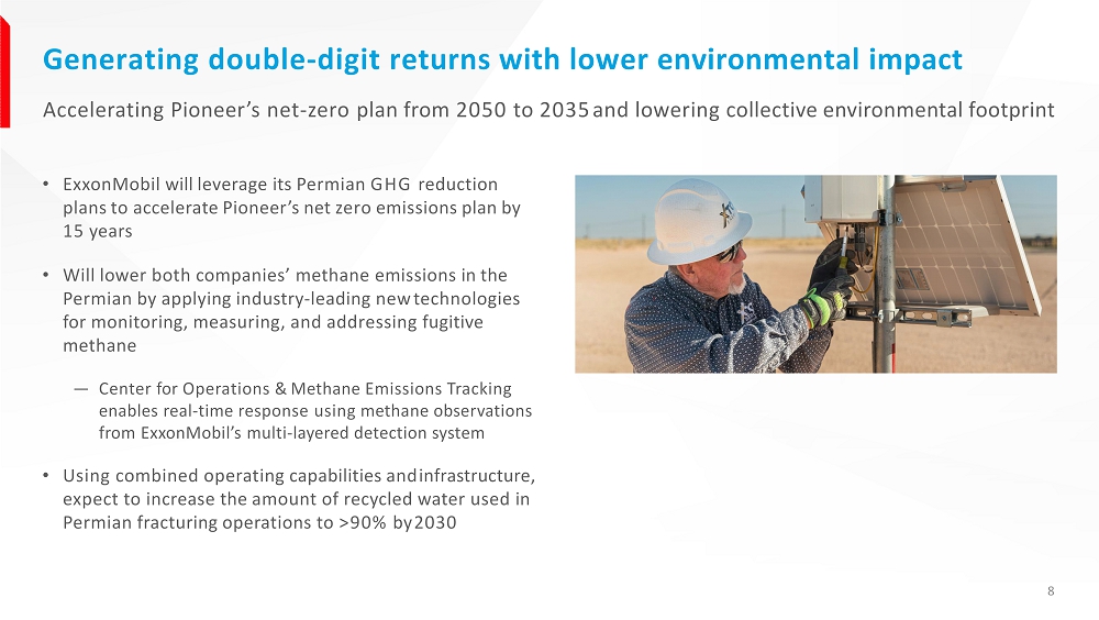 Generate double - digit returns by recovering more resource, more efficiently 7 Combining the capabilities and know - how of both companies • Leveraging ExxonMobil’s scale, technology, and industry - leading development to increase resource recovery, delivering leading capital efficiency and cost performance — Successfully drilling industry - leading longer laterals (up to 4 miles), resulting in fewer wells and a smaller surface footprint — Demonstrating best - in - class drilling efficiency with fewer days to drill and complete • Leveraging Pioneer’s entrepreneurial culture and industry - leading longstanding expertise operating in the Midland Basin • Further upside from applying ExxonMobil’s large emerging technology portfolio at scale to increase resource recovery — Multi - year rock physics research and field diagnostic programs to improve fracture design — Differentiated well fracture geometry increasing completion effectiveness — Optimized well spacing • Enhanced field digitalization and automation via remote operations center — Enables real - time adjustments across large - scale operations, optimizing both throughput and cost