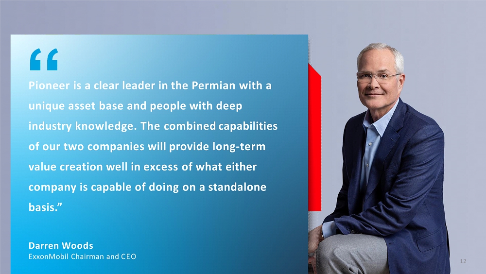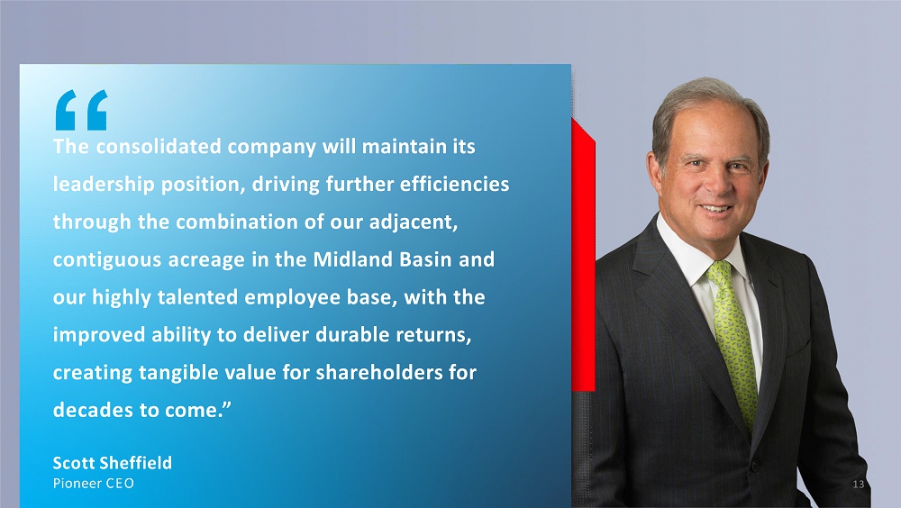 Pioneer is a clear leader in the Permian with a unique asset base and people with deep industry knowledge. The combined capabilities of our two companies will provide long - term value creation well in excess of what either company is capable of doing on a standalone basis.” 12 Darren Woods ExxonMobil Chairman and CEO