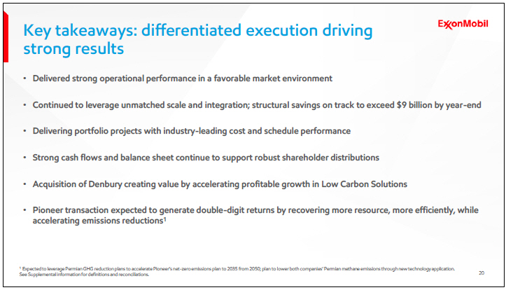 Earlier this month, we signed an agreement to acquire Pioneer Natural Resources in another all- stock transaction. This combination will further strengthen our already advantaged Upstream portfolio and create significant value for the shareholders of both companies. Together we will recover more resource, more efficiently, and with a lower environmental impact. We plan to accelerate Pioneer’s Permian net zero ambition by 15 years and fully leverage their advances in water recycling. This deal is a win any way you look at it: good for our shareholders, good for the environment, good for the economy, and good for U.S. energy security. Neil will say more about the benefits of the transaction in a few moments.