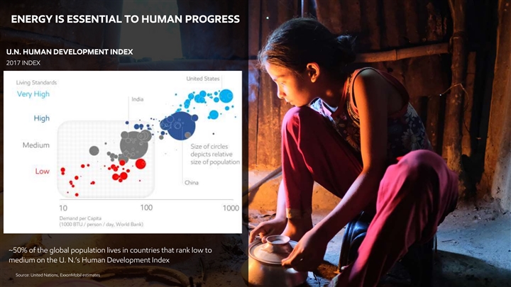 ENERGY IS ESSENTIAL TO HUMAN PROGRESS U.N. HUMAN DEVELOPMENT INDEX 2017 INDEX ~50% of the global population lives in countries that rank low to medium on the U. N.’s Human Development Index Source: United Nations, ExxonMobil estimatesENERGY IS ESSENTIAL TO HUMAN PROGRESS U.N. HUMAN DEVELOPMENT INDEX 2017 INDEX ~50% of the global population lives in countries that rank low to medium on the U. N.’s Human Development Index Source: United Nations, ExxonMobil estimates