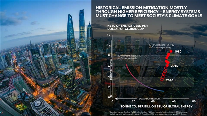 HISTORICAL EMISSION MITIGATION MOSTLY THROUGH HIGHER EFFICIENCY – ENERGY SYSTEMS MUST CHANGE TO MEET SOCIETY’S CLIMATE GOALS KBTU OF ENERGY USED PER DOLLAR OF GLOBAL GDP 2018 Outlook for Energy performance pathway 1980 2040 hypothetical 2° C performance levels* 2015 2040 TONNE CO PER BILLION BTU OF GLOBAL ENERGY 2 * Based on average Stanford EMF27 full technology / 450ppm scenarios’ CO emissions (~20 billion tonnes 2 including energy and industrial processes), ExxonMobil GDP assumptions consistent with 2018 OutlookHISTORICAL EMISSION MITIGATION MOSTLY THROUGH HIGHER EFFICIENCY – ENERGY SYSTEMS MUST CHANGE TO MEET SOCIETY’S CLIMATE GOALS KBTU OF ENERGY USED PER DOLLAR OF GLOBAL GDP 2018 Outlook for Energy performance pathway 1980 2040 hypothetical 2° C performance levels* 2015 2040 TONNE CO PER BILLION BTU OF GLOBAL ENERGY 2 * Based on average Stanford EMF27 full technology / 450ppm scenarios’ CO emissions (~20 billion tonnes 2 including energy and industrial processes), ExxonMobil GDP assumptions consistent with 2018 Outlook