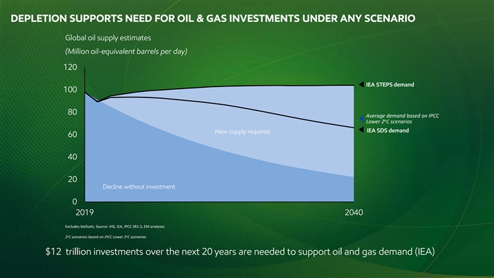PROGRESSING SOLUTIONS DEPLETION SUPPORTS NEED FOR OIL & GAS INVESTMENTS UNDER ANY SCENARIO Global oil supply estimates (Million oil-equivalent barrels per day) 120 IEA STEPS demand 100 80 Average demand based on IPCC o Lower 2 C scenarios IEA SDS demand New supply required 60 40 20 Decline without investment 0 2019 2040 Excludes biofuels; Source: IHS, IEA, IPCC SR1.5, EM analyses o o 2 C scenarios based on IPCC Lower 2 C scenarios $12 trillion investments over the next 20 years are needed to support oil and gas demand (IEA)PROGRESSING SOLUTIONS DEPLETION SUPPORTS NEED FOR OIL & GAS INVESTMENTS UNDER ANY SCENARIO Global oil supply estimates (Million oil-equivalent barrels per day) 120 IEA STEPS demand 100 80 Average demand based on IPCC o Lower 2 C scenarios IEA SDS demand New supply required 60 40 20 Decline without investment 0 2019 2040 Excludes biofuels; Source: IHS, IEA, IPCC SR1.5, EM analyses o o 2 C scenarios based on IPCC Lower 2 C scenarios $12 trillion investments over the next 20 years are needed to support oil and gas demand (IEA)