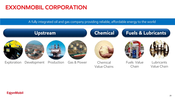 EXXONMOBIL CORPORATION A fully integrated oil and gas company providing reliable, affordable energy to the world Upstream Chemical Fuels & Lubricants Exploration Development Production Gas & Power Fuels Value Lubricants Chemical Chain Value Chain Value Chains 20EXXONMOBIL CORPORATION A fully integrated oil and gas company providing reliable, affordable energy to the world Upstream Chemical Fuels & Lubricants Exploration Development Production Gas & Power Fuels Value Lubricants Chemical Chain Value Chain Value Chains 20