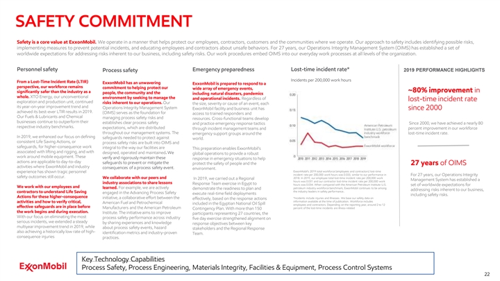 SAFETY COMMITMENT Safety is a core value at ExxonMobil. We operate in a manner that helps protect our employees, contractors, customers and the communities where we operate. Our approach to safety includes identifying possible risks, implementing measures to prevent potential incidents, and educating employees and contractors about unsafe behaviors. For 27 years, our Operations Integrity Management System (OIMS) has established a set of worldwide expectations for addressing risks inherent to our business, including safety risks. Our work procedures embed OIMS into our everyday work processes at all levels of the organization. Personnel safety Emergency preparedness Lost-time incident rate* 2019 PERFORMANCE HIGHLIGHTS Process safety Incidents per 200,000 work hours From a Lost-Time Incident Rate (LTIR) ExxonMobil has an unwavering ExxonMobil is prepared to respond to a perspective, our workforce remains commitment to helping protect our wide array of emergency events, ~80% improvement in significantly safer than the industry as a people, the community and the including natural disasters, pandemics whole. XTO Energy, our unconventional environment by seeking to manage the and operational incidents. Regardless of lost-time incident rate exploration and production unit, continued risks inherent to our operations. Our the size, severity or cause of an event, each its year-on-year improvement trend and Operations Integrity Management System ExxonMobil facility and business unit has since 2000 achieved its best-ever LTIR results in 2019. (OIMS) serves as the foundation for access to trained responders and Our Fuels & Lubricants and Chemical managing process safety risks and resources. Cross-functional teams develop businesses continue to outperform their establishes clear process safety and practice emergency response tactics Since 2000, we have achieved a nearly 80 respective industry benchmarks. expectations, which are distributed through incident management teams and percent improvement in our workforce throughout our management systems. The emergency support groups around the lost-time incident rate. In 2019, we enhanced our focus on defining safeguards needed to protect against world. consistent Life Saving Actions, or process safety risks are built into OIMS and safeguards, for higher-consequence work integral to the way our facilities are This preparation enables ExxonMobil’s associated with lifting and rigging, and with designed, operated and maintained. We global operations to provide a robust work around mobile equipment. These verify and rigorously maintain these response in emergency situations to help actions are applicable to day-to-day safeguards to prevent or mitigate the protect the safety of people and the 27 years of OIMS activities where ExxonMobil and industry consequences of a process safety event. environment. ExxonMobil’s 2019 total workforce (employees and contractors) lost-time experience has shown tragic personnel incident rate per 200,000 work hours was 0.033, similar to our performance in For 27 years, our Operations Integrity safety outcomes still occur. We collaborate with our peers and 2018. In 2019, our employee total lost-time incident rate per 200,000 work In 2019, we carried out a Regional Management System has established a hours was 0.031 and our contractor lost-time incident rate per 200,000 work industry associations to share lessons Response Team exercise in Egypt to hours was 0.034. When compared with the American Petroleum Institute U.S. set of worldwide expectations for We work with our employees and learned. For example, we are actively petroleum industry workforce benchmark, ExxonMobil continues to be among demonstrate the readiness to plan and addressing risks inherent to our business, the industry leaders in safety performance.. contractors to understand Life Saving engaged in the Advancing Process Safety execute real-time field deployments including safety risks. Actions for these higher-consequence initiative, a collaborative effort between the *Incidents include injuries and illnesses. We base our safety data on effectively, based on the response actions information available at the time of publication. Workforce includes activities and how to verify critical, American Fuel and Petrochemical included in the Egyptian National Oil Spill employees and contractors. Depending on the reporting year, around 2 to 12 effective safeguards are in place before Manufacturers and the American Petroleum percent of the lost-time incidents are illness-related Contingency Plan. With more than 150 the work begins and during execution. Institute. The initiative aims to improve participants representing 27 countries, the With our focus on eliminating the most process safety performance across industry five day exercise strengthened alignment on serious incidents, we extended a steady by sharing experiences and knowledge response objectives between key multiyear improvement trend in 2019, while about process safety events, hazard stakeholders and the Regional Response also achieving a historically low rate of high- identification metrics and industry-proven Team. consequence injuries practices. Key Technology Capabilities Process Safety, Process Engineering, Materials Integrity, Facilities & Equipment, Process Control Systems 22SAFETY COMMITMENT Safety is a core value at ExxonMobil. We operate in a manner that helps protect our employees, contractors, customers and the communities where we operate. Our approach to safety includes identifying possible risks, implementing measures to prevent potential incidents, and educating employees and contractors about unsafe behaviors. For 27 years, our Operations Integrity Management System (OIMS) has established a set of worldwide expectations for addressing risks inherent to our business, including safety risks. Our work procedures embed OIMS into our everyday work processes at all levels of the organization. Personnel sa