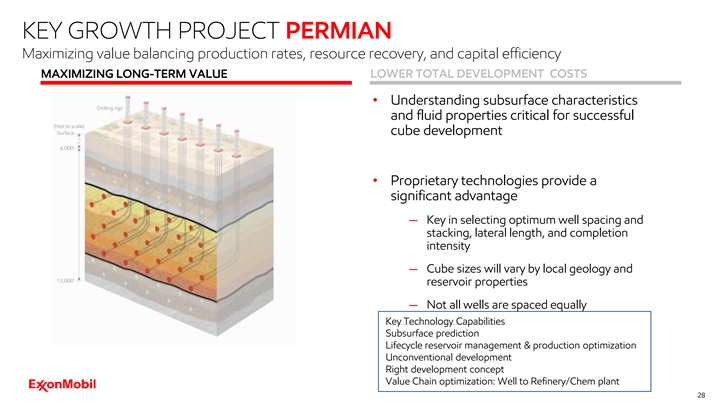 KEY GROWTH PROJECT PERMIAN Maximizing value balancing production rates, resource recovery, and capital efficiency MAXIMIZING LONG-TERM VALUE LOWER TOTAL DEVELOPMENT COSTS • Cube drilling simultaneously develops multiple stacked pay zones — Greatly reduces parent-child impacts — Maximizes resource recovery — Increases resource value (NPV) versus “best well” and “best bench” developments • Capital efficient large-scale cube development has multiple requirements — Capacity to run multiple rigs simultaneously — Surface infrastructure and logistics aligned with production ramp-up 27KEY GROWTH PROJECT PERMIAN Maximizing value balancing production rates, resource recovery, and capital efficiency MAXIMIZING LONG-TERM VALUE LOWER TOTAL DEVELOPMENT COSTS • Cube drilling simultaneously develops multiple stacked pay zones — Greatly reduces parent-child impacts — Maximizes resource recovery — Increases resource value (NPV) versus “best well” and “best bench” developments • Capital efficient large-scale cube development has multiple requirements — Capacity to run multiple rigs simultaneously — Surface infrastructure and logistics aligned with production ramp-up 27