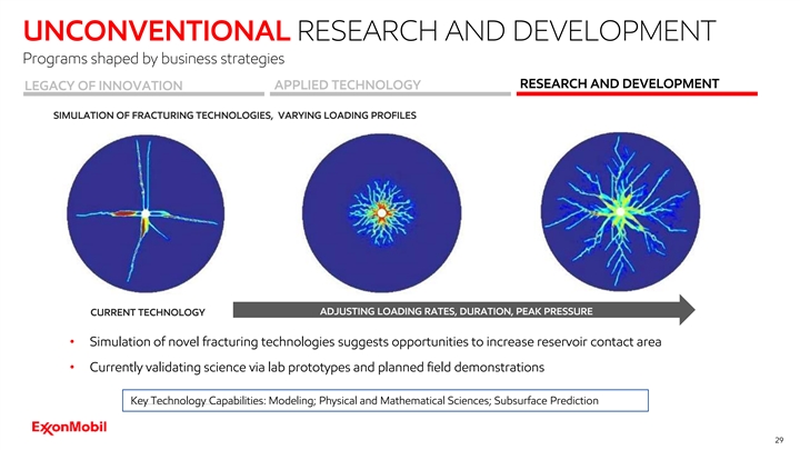 UNCONVENTIONAL RESEARCH AND DEVELOPMENT Programs shaped by business strategies RESEARCH AND DEVELOPMENT LEGACY OF INNOVATION APPLIED TECHNOLOGY SIMULATION OF FRACTURING TECHNOLOGIES, VARYING LOADING PROFILES ADJUSTING LOADING RATES, DURATION, PEAK PRESSURE CURRENT TECHNOLOGY • Simulation of novel fracturing technologies suggests opportunities to increase reservoir contact area • Currently validating science via lab prototypes and planned field demonstrations Key Technology Capabilities: Modeling; Physical and Mathematical Sciences; Subsurface Prediction 29UNCONVENTIONAL RESEARCH AND DEVELOPMENT Programs shaped by business strategies RESEARCH AND DEVELOPMENT LEGACY OF INNOVATION APPLIED TECHNOLOGY SIMULATION OF FRACTURING TECHNOLOGIES, VARYING LOADING PROFILES ADJUSTING LOADING RATES, DURATION, PEAK PRESSURE CURRENT TECHNOLOGY • Simulation of novel fracturing technologies suggests opportunities to increase reservoir contact area • Currently validating science via lab prototypes and planned field demonstrations Key Technology Capabilities: Modeling; Physical and Mathematical Sciences; Subsurface Prediction 29