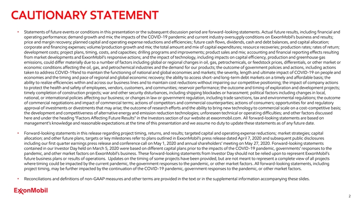 CAUTIONARY STATEMENT • Statements of future events or conditions in this presentation or the subsequent discussion period are forward-looking statements. Actual future results, including financial and operating performance; demand growth and mix; the impacts of the COVID-19 pandemic and current industry oversupply conditions on ExxonMobil’s business and results; price and margin recovery; planned capital and operating expense reductions and efficiencies; future cash flows, dividends, cash and debt balances, and capital allocation; corporate and financing expenses; volume/production growth and mix; the total amount and mix of capital expenditures; resource recoveries; production rates; rates of return; development costs; project plans, timing, costs, and capacities; drilling programs and improvements; product sales and mix; accounting and financial reporting effects resulting from market developments and ExxonMobil’s responsive actions; and the impact of technology, including impacts on capital efficiency, production and greenhouse gas emissions, could differ materially due to a number of factors including global or regional changes in oil, gas, petrochemicals, or feedstock prices, differentials, or other market or economic conditions affecting the oil, gas, and petrochemical industries and the demand for our products; the outcome of government policies and actions, including actions taken to address COVID-19and to maintain the functioning of national and global economies and markets; the severity, length and ultimate impact of COVID-19 on people and economies and the timing and pace of regional and global economic recovery; the ability to access short-and long-term debt markets on a timely and affordable basis; the ability to realize efficiencies within and across our business lines and to maintain cost reductions without impairing our competitive positioning; the impact of company actions to protect the health and safety of employees, vendors, customers, and communities; reservoir performance; the outcome and timing of exploration and development projects; timely completion of construction projects; war and other security disturbances, including shipping blockades or harassment; political factors including changes in local, national, or international policies affecting our business; or changes in law or government regulation, including trade sanctions, tax and environmental regulations; the outcome of commercial negotiations and impact of commercial terms; actions of competitors and commercial counterparties; actions of consumers; opportunities for and regulatory approval of investments or divestments that may arise; the outcome of research efforts and the ability to bring new technology to commercial scale on a cost-competitive basis; the development and competitiveness of alternative energy and emission reduction technologies; unforeseen technical or operating difficulties; and other factors discussed here and under the heading Factors Affecting Future Results in the Investors section of our website at exxonmobil.com. All forward-looking statements are based on management’s knowledge and reasonable expectations at the time of this presentation and we assume no duty to update these statements as of any future date. • Forward-looking statements in this release regarding project timing, returns, and results; targeted capital and operating expense reductions; market strategies; capital allocation; and other future plans, targets or key milestones refer to plans outlined in ExxonMobil’s press release dated April 7, 2020 and subsequent public disclosures including our first quarter earnings press release and conference call on May 1, 2020 and annual shareholders’ meeting on May 27, 2020. Forward-looking statements contained in our Investor Day held on March 5, 2020 were based on different capital plans prior to the impacts of the COVID-19 pandemic, governments’ responses to the pandemic, and other market factors on ExxonMobil’s business. These forward-looking statements from Investor Day should not be relied upon to represent ExxonMobil’s future business plans or results of operations. Updates on the timing of some projects have been provided, but are not meant to represent a complete view of all projects where timing could be impacted by the current pandemic, the government responses to the pandemic, or other market factors. All forward-looking statements, including project timing, may be further impacted by the continuation of the COVID-19 pandemic, government responses to the pandemic, or other market factors. • Reconciliations and definitions of non-GAAP measures and other terms are provided in the text or in the supplemental information accompanying these slides. 2CAUTIONARY STATEMENT • Statements of future events or conditions in this presentation or the subsequent discussion period are forward-looking statements. Actual future results, including financial and operating performance; demand growth and mix; the impacts of the COVID-19 pandemic and current industry oversupply conditions on ExxonMobil’s business and results; price and margin recovery; planned capital and operating expense reductions and efficiencies; future cash flows, dividends, cash and debt balances, and capital allocation; corporate and financing expenses; volume/production growth and mix; the total amount and mix of capital expenditures; resource recoveries; production rates; rates of return; development costs; project plans, timing, costs, and capacities; drilling programs and improvements; product sales and mix; accounting and financial reporting effects resulting from market developments and ExxonMobil’s responsive actions; and the impact of technology, including impacts on capital efficiency, production and greenhouse gas emissions, could differ materially due to a number of factors including global or regional changes in oil, gas, petrochemicals, or feedstock prices, differentials, or