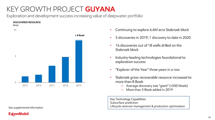 KEY GROWTH PROJECT GUYANA Exploration and development success increasing value of deepwater portfolio DISCOVERED RESOURCE Boeb 10• Continuing to explore 6.6M acre Stabroek block > 8 Boeb • 5 discoveries in 2019; 1 discovery to date in 2020 • 16 discoveries out of 18 wells drilled on the Stabroek block 5 • Industry-leading technologies foundational to exploration success • “Explorer of the Year” three years in a row • Stabroek gross recoverable resource increased to more than 8 Boeb 0 2015 2016 2017 2018 2019 — Average discovery size “giant” (>500 Moeb) — More than 3 Boeb added in 2019 Key Technology Capabilities Subsurface prediction Lifecycle reservoir management & production optimization See supplemental information 30KEY GROWTH PROJECT GUYANA Exploration and development success increasing value of deepwater portfolio DISCOVERED RESOURCE Boeb 10• Continuing to explore 6.6M acre Stabroek block > 8 Boeb • 5 discoveries in 2019; 1 discovery to date in 2020 • 16 discoveries out of 18 wells drilled on the Stabroek block 5 • Industry-leading technologies foundational to exploration success • “Explorer of the Year” three years in a row • Stabroek gross recoverable resource increased to more than 8 Boeb 0 2015 2016 2017 2018 2019 — Average discovery size “giant” (>500 Moeb) — More than 3 Boeb added in 2019 Key Technology Capabilities Subsurface prediction Lifecycle reservoir management & production optimization See supplemental information 30