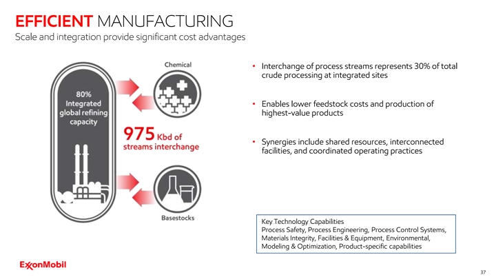 EFFICIENT MANUFACTURING Scale and integration provide significant cost advantages SCALE OPEX • Average refinery capacity 75% higher than industry Indexed vs. industry Indexed vs. industry 100% 180% • Cost advantage of 10% compared to average refiner, resulting in $900M annual benefit • First-quartile energy efficiency with 34 120% 90% cogeneration units across network • Advanced analytics, applied across global refining network, strengthen efficiency and reliability 60% 80% Industry ExxonMobil Industry ExxonMobil Key Technology Capabilities Source: S&P Global Platts and ExxonMobil analysis Source: Solomon 2018 data, ExxonMobil estimates Facilities & Equipment, Modeling & Optimization, Materials Integrity, Process Control Systems, Process Innovation & Development, Active Materials, Process Engineering 36EFFICIENT MANUFACTURING Scale and integration provide significant cost advantages SCALE OPEX • Average refinery capacity 75% higher than industry Indexed vs. industry Indexed vs. industry 100% 180% • Cost advantage of 10% compared to average refiner, resulting in $900M annual benefit • First-quartile energy efficiency with 34 120% 90% cogeneration units across network • Advanced analytics, applied across global refining network, strengthen efficiency and reliability 60% 80% Industry ExxonMobil Industry ExxonMobil Key Technology Capabilities Source: S&P Global Platts and ExxonMobil analysis Source: Solomon 2018 data, ExxonMobil estimates Facilities & Equipment, Modeling & Optimization, Materials Integrity, Process Control Systems, Process Innovation & Development, Active Materials, Process Engineering 36