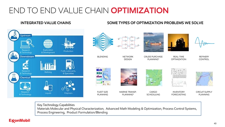 END TO END VALUE CHAIN OPTIMIZATION INTEGRATED VALUE CHAINS SOME TYPES OF OPTIMIZATION PROBLEMS WE SOLVE BLENDING NETWORK CRUDE PURCHASE REAL-TIME REFINERY DESIGN PLANNING* OPTIMIZATION CONTROL FLEET SIZE MARINE TRANSP. CARGO INVENTORY CIRCUIT SUPPLY PLANNING PLANNING* SCHEDULING FORECASTING PLANNING Key Technology Capabilities Materials Molecular and Physical Characterization, Advanced Math Modeling & Optimization, Process Control Systems, Process Engineering, Product Formulation/Blending 40END TO END VALUE CHAIN OPTIMIZATION INTEGRATED VALUE CHAINS SOME TYPES OF OPTIMIZATION PROBLEMS WE SOLVE BLENDING NETWORK CRUDE PURCHASE REAL-TIME REFINERY DESIGN PLANNING* OPTIMIZATION CONTROL FLEET SIZE MARINE TRANSP. CARGO INVENTORY CIRCUIT SUPPLY PLANNING PLANNING* SCHEDULING FORECASTING PLANNING Key Technology Capabilities Materials Molecular and Physical Characterization, Advanced Math Modeling & Optimization, Process Control Systems, Process Engineering, Product Formulation/Blending 40