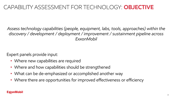 CAPABILITY ASSESSMENT FOR TECHNOLOGY: OBJECTIVE Assess technology capabilities (people, equipment, labs, tools, approaches) within the discovery / development / deployment / improvement / sustainment pipeline across ExxonMobil Expert panels provide input: • Where new capabilities are required • Where and how capabilities should be strengthened • What can be de-emphasized or accomplished another way • Where there are opportunities for improved effectiveness or efficiency 3CAPABILITY ASSESSMENT FOR TECHNOLOGY: OBJECTIVE Assess technology capabilities (people, equipment, labs, tools, approaches) within the discovery / development / deployment / improvement / sustainment pipeline across ExxonMobil Expert panels provide input: • Where new capabilities are required • Where and how capabilities should be strengthened • What can be de-emphasized or accomplished another way • Where there are opportunities for improved effectiveness or efficiency 3