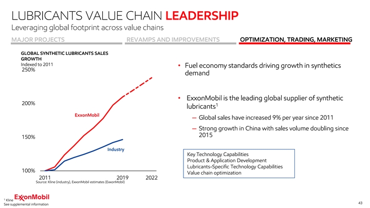 LUBRICANTS VALUE CHAIN LEADERSHIP Leveraging global footprint across value chains MAJOR PROJECTS REVAMPS AND IMPROVEMENTS OPTIMIZATION, TRADING, MARKETING GLOBAL SYNTHETIC LUBRICANTS SALES GROWTH Indexed to 2011 • Fuel economy standards driving growth in synthetics 250% demand • ExxonMobil is the leading global supplier of synthetic 200% 1 lubricants ExxonMobil — Global sales have increased 9% per year since 2011 — Strong growth in China with sales volume doubling since 2015 150% Industry Key Technology Capabilities Product & Application Development Lubricants-Specific Technology Capabilities 100% Value chain optimization 2011 2019 2022 Source: Kline (industry), ExxonMobil estimates (ExxonMobil) 1 Kline 43 See supplemental informationLUBRICANTS VALUE CHAIN LEADERSHIP Leveraging global footprint across value chains MAJOR PROJECTS REVAMPS AND IMPROVEMENTS OPTIMIZATION, TRADING, MARKETING GLOBAL SYNTHETIC LUBRICANTS SALES GROWTH Indexed to 2011 • Fuel economy standards driving growth in synthetics 250% demand • ExxonMobil is the leading global supplier of synthetic 200% 1 lubricants ExxonMobil — Global sales have increased 9% per year since 2011 — Strong growth in China with sales volume doubling since 2015 150% Industry Key Technology Capabilities Product & Application Development Lubricants-Specific Technology Capabilities 100% Value chain optimization 2011 2019 2022 Source: Kline (industry), ExxonMobil estimates (ExxonMobil) 1 Kline 43 See supplemental information