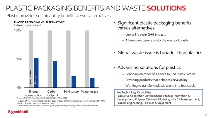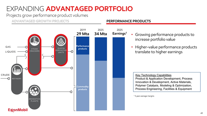 CURRENT ASSET PORTFOLIO Maintaining market leadership across majority of product applications 2019 29 Mta Market 1 position Example applications GAS OLE F I N STE A M D E R I VA TI VE CR A CK E R S P O L Y E T H Y L E N E LIQUIDS U NI TS Packaging, agricultural film, piping, liquid 1 containers P O L Y P R O P Y L E N E 9 Automotive, appliance, hygiene, diapers O T H E R 1 Fluids: drilling fluids, solvents CRUDE R E F I NE R Y E X A M P L E S : 1 Synthetics: lubricants F L U I D S S Y N T H E T I C S 1 Butyl: tires B U T Y L V I S T A M A X X 1 Vistamaxx: packaging, molded parts A R OMA TI CS P LA NTS 2 P A R A X Y L E N E 2 Clothing, food, liquid containers 1 IHS Markit and ExxonMobil estimates based on available data 2 Market position includes paraxylene and benzene Key Technology Capabilities (In addition to all those required for manufacturing support and process development Product & Application Development 48CURRENT ASSET PORTFOLIO Maintaining market leadership across majority of product applications 2019 29 Mta Market 1 position Example applications GAS OLE F I N STE A M D E R I VA TI VE CR A CK E R S P O L Y E T H Y L E N E LIQUIDS U NI TS Packaging, agricultural film, piping, liquid 1 containers P O L Y P R O P Y L E N E 9 Automotive, appliance, hygiene, diapers O T H E R 1 Fluids: drilling fluids, solvents CRUDE R E F I NE R Y E X A M P L E S : 1 Synthetics: lubricants F L U I D S S Y N T H E T I C S 1 Butyl: tires B U T Y L V I S T A M A X X 1 Vistamaxx: packaging, molded parts A R OMA TI CS P LA NTS 2 P A R A X Y L E N E 2 Clothing, food, liquid containers 1 IHS Markit and ExxonMobil estimates based on available data 2 Market position includes paraxylene and benzene Key Technology Capabilities (In addition to all those required for manufacturing support and process development Product & Application Development 48