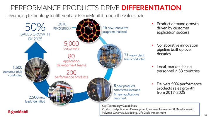 PERFORMANCE PRODUCTS DRIVE DIFFERENTIATION Leveraging technology to differentiate ExxonMobil through the value chain • Product demand growth 2018 46 new, innovative driven by customer PROGRESS 50% programs initiated application success SALES GROWTH BY 2025 5,000 • Collaborative innovation customers pipeline built up over decades 71 major plant 80 trials conducted application development teams • Local, market-facing 1,500 personnel in 33 countries customer trials 200 conducted performance products • Delivers 50% performance 8 new products products sales growth commercialized and from 2017-2025 6 new applications 2,500 new launched leads identified Key Technology Capabilities Product & Application Development, Process Innovation & Development, Polymer Catalysis, Modeling, Life Cycle Assessment 50PERFORMANCE PRODUCTS DRIVE DIFFERENTIATION Leveraging technology to differentiate ExxonMobil through the value chain • Product demand growth 2018 46 new, innovative driven by customer PROGRESS 50% programs initiated application success SALES GROWTH BY 2025 5,000 • Collaborative innovation customers pipeline built up over decades 71 major plant 80 trials conducted application development teams • Local, market-facing 1,500 personnel in 33 countries customer trials 200 conducted performance products • Delivers 50% performance 8 new products products sales growth commercialized and from 2017-2025 6 new applications 2,500 new launched leads identified Key Technology Capabilities Product & Application Development, Process Innovation & Development, Polymer Catalysis, Modeling, Life Cycle Assessment 50